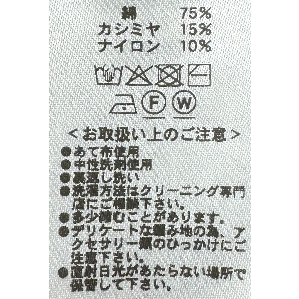 ・コットン75%とカシミア15%の風合いの良さは着用を重ねるごとに深まり(肌に触れる部分にナイロンは混紡されていません)、ご家庭での洗濯(手洗い)が可能な型崩れしにくい編み地です。