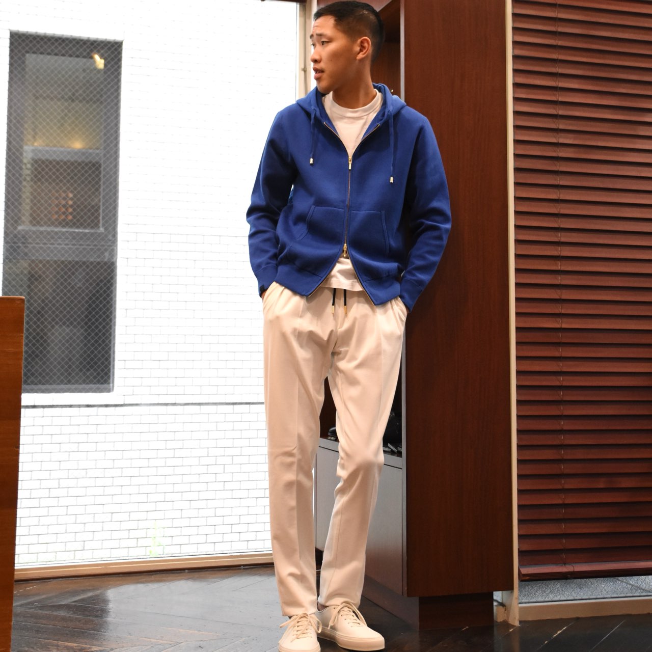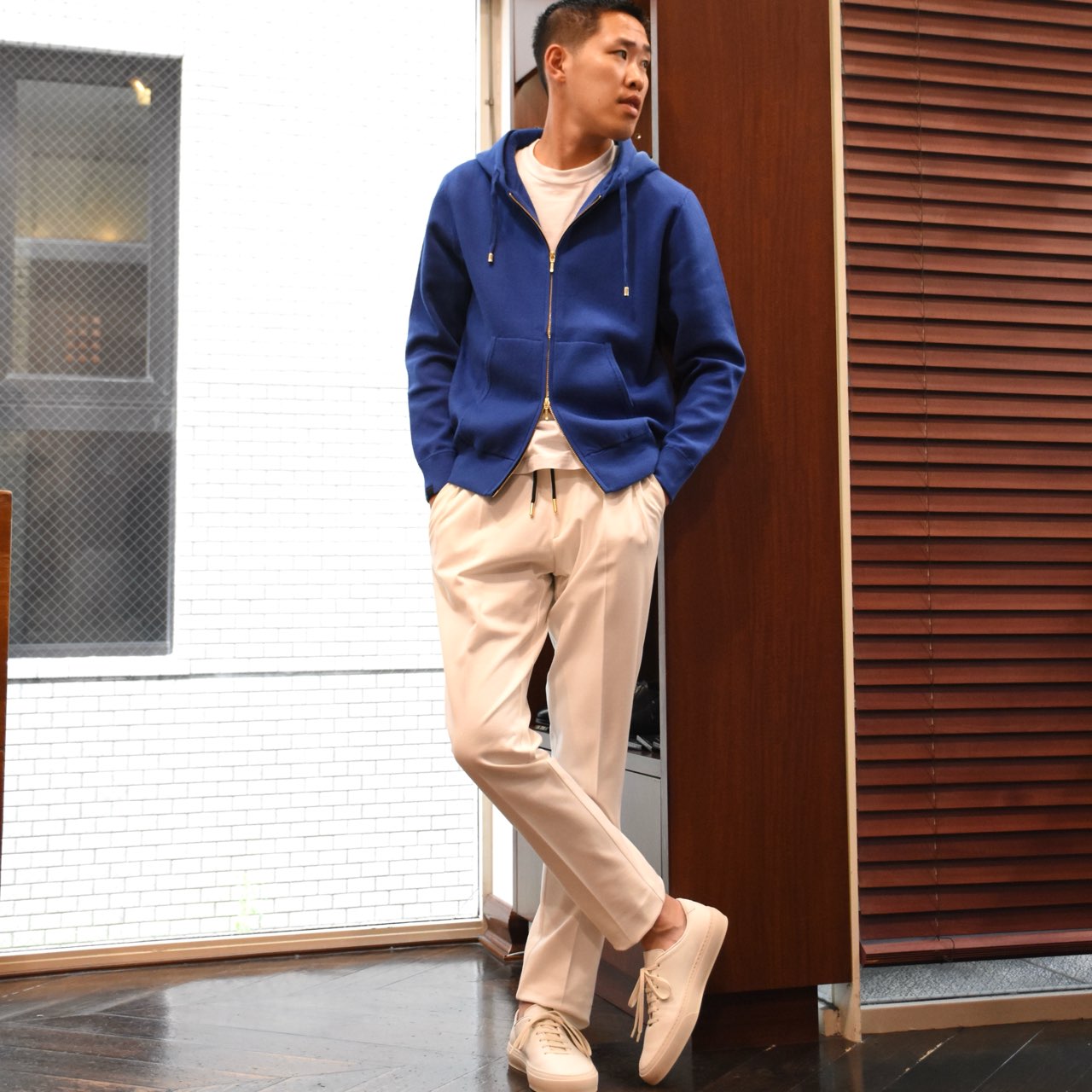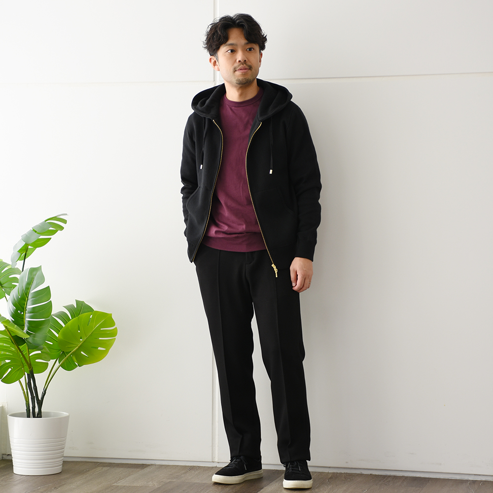 ・プルオーバーと同じイメージのシルエットを踏襲しつつも、ジップアップで前が開くという点を考慮し、身幅を細く着丈も短く、といった若干のモディファイをすることで、前開きで着た際にルーズに見えないバランスに仕上げています。