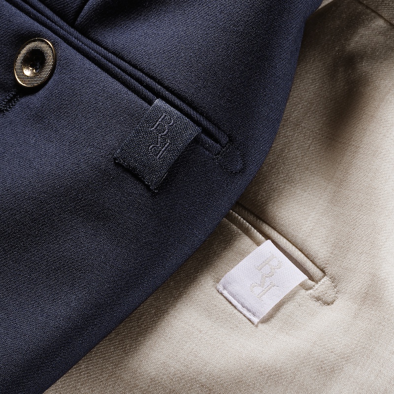 ⑤右ヒップポケット口に生地のカラーにトーンを合わせたBRロゴ入りピスネームを取り付け