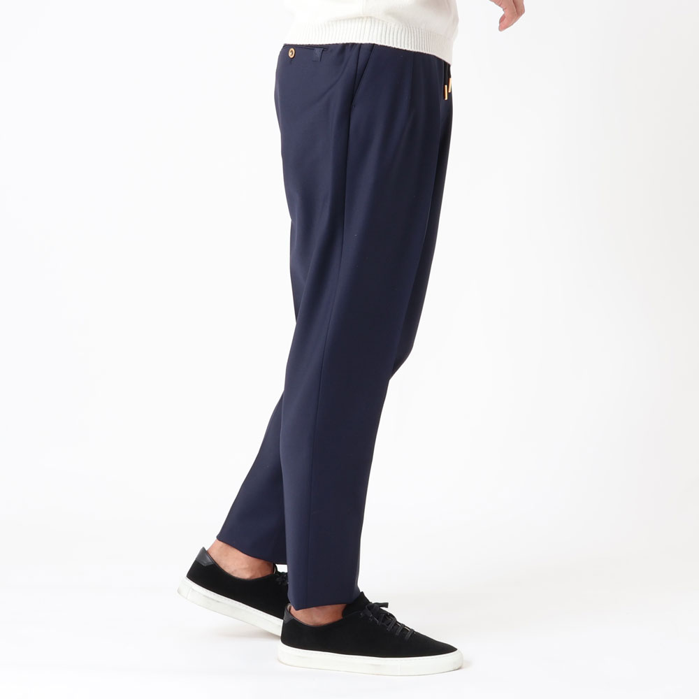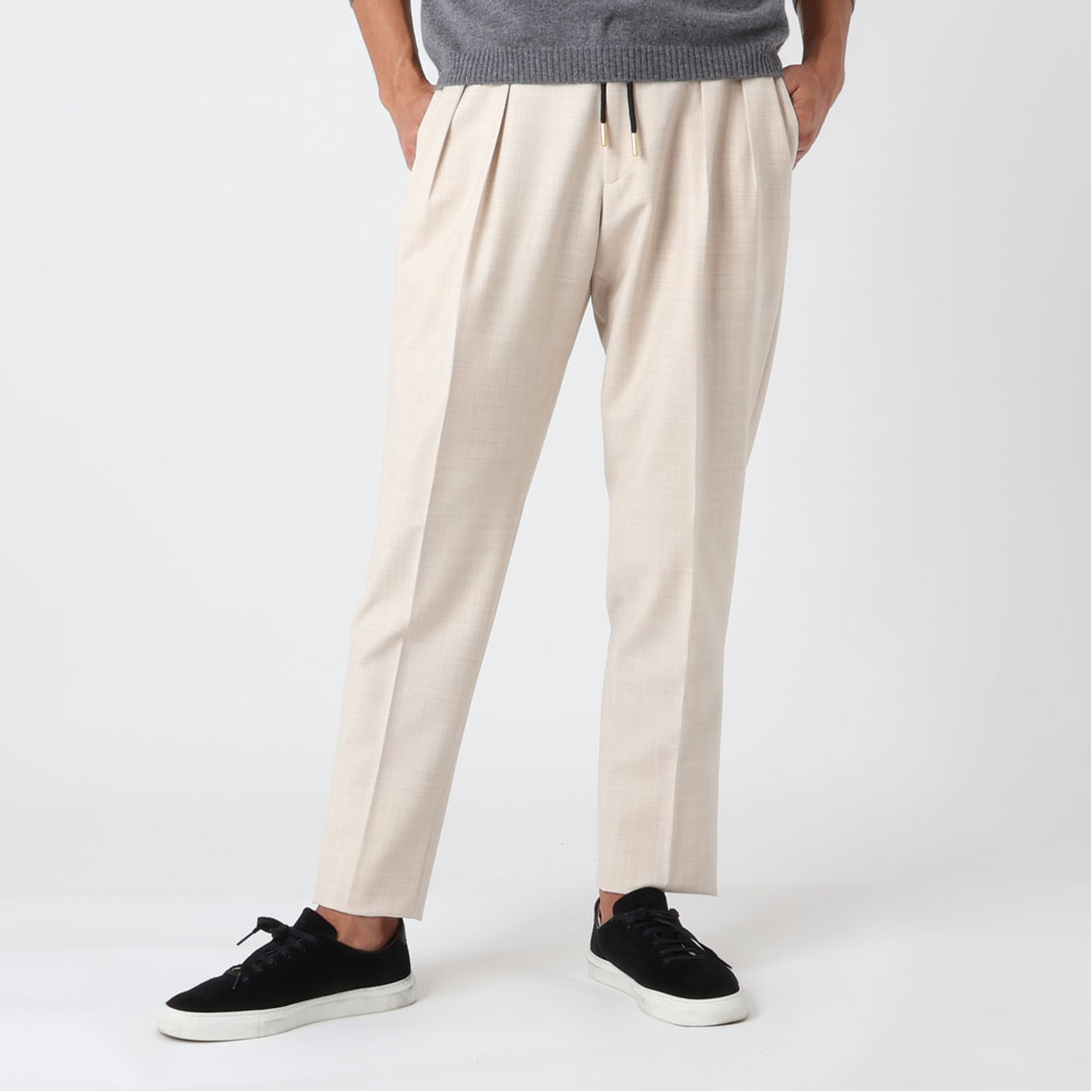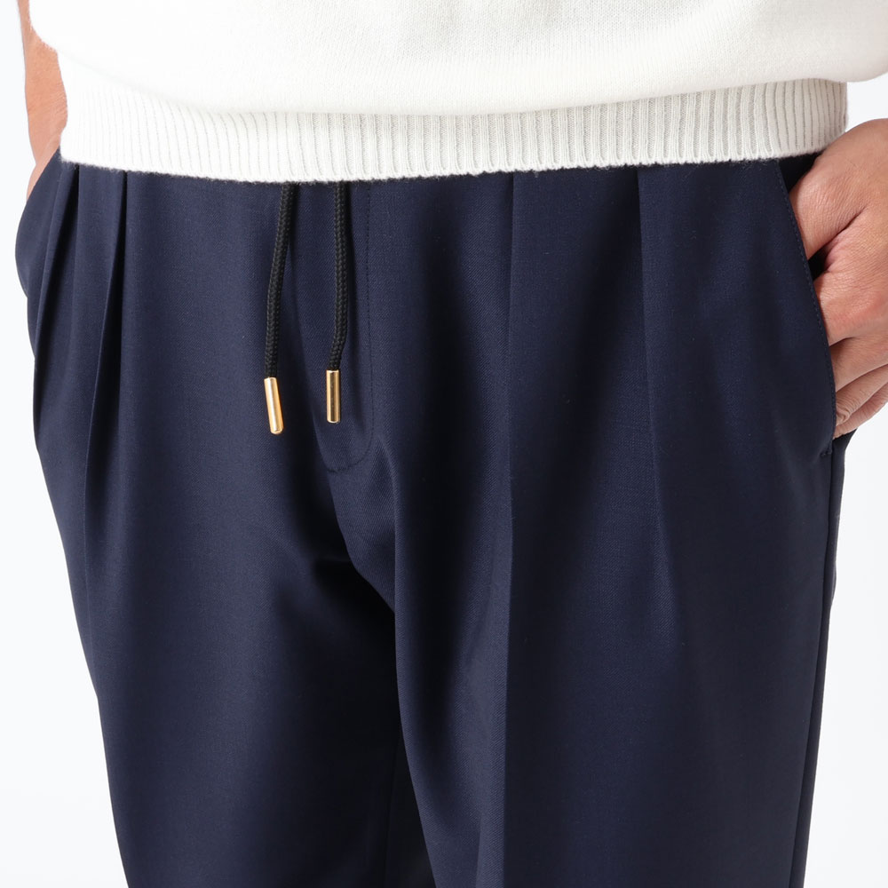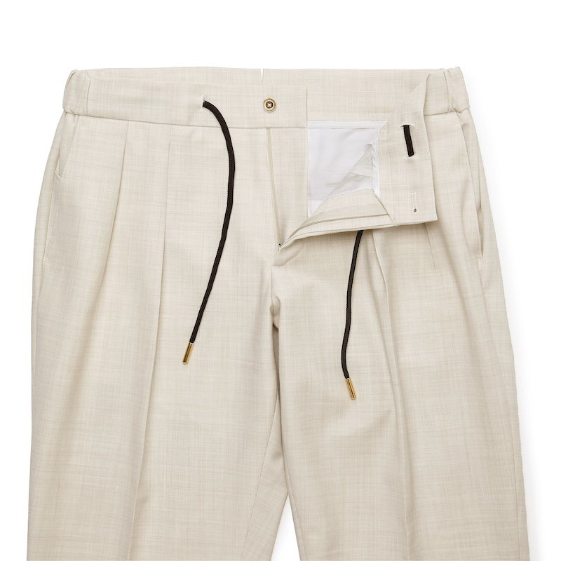 • ゴールドパーツ、2インプリーツ、ウエストサイドシャーリングゴム&ドローコード付き、前ポケット×3、後ポケット×2、フロントジップ、裾口アンフィニッシュ