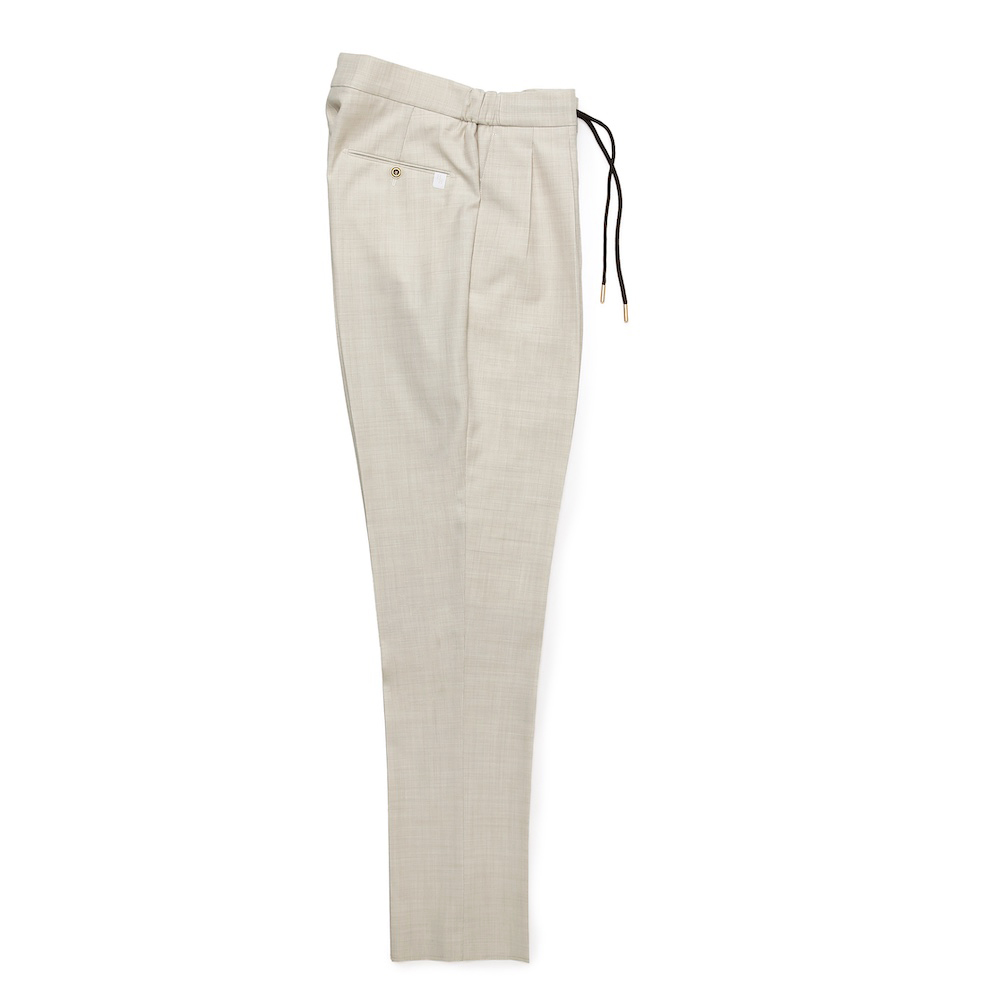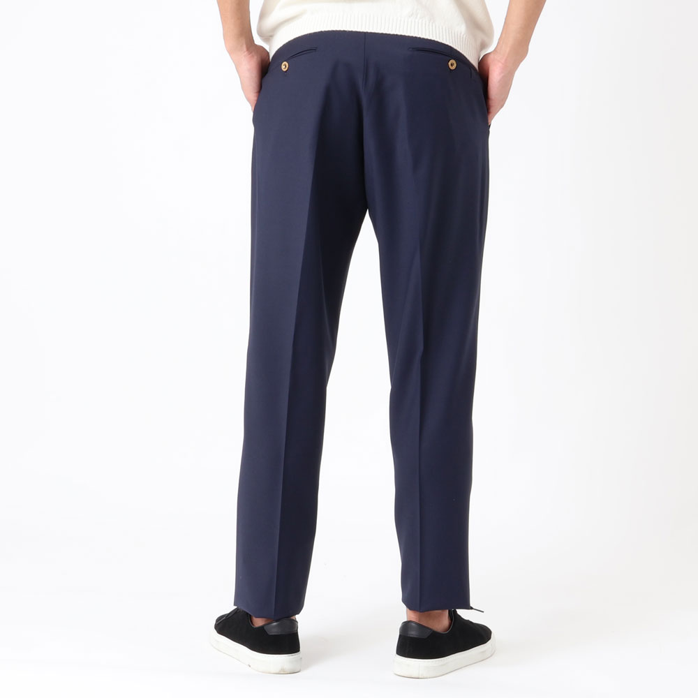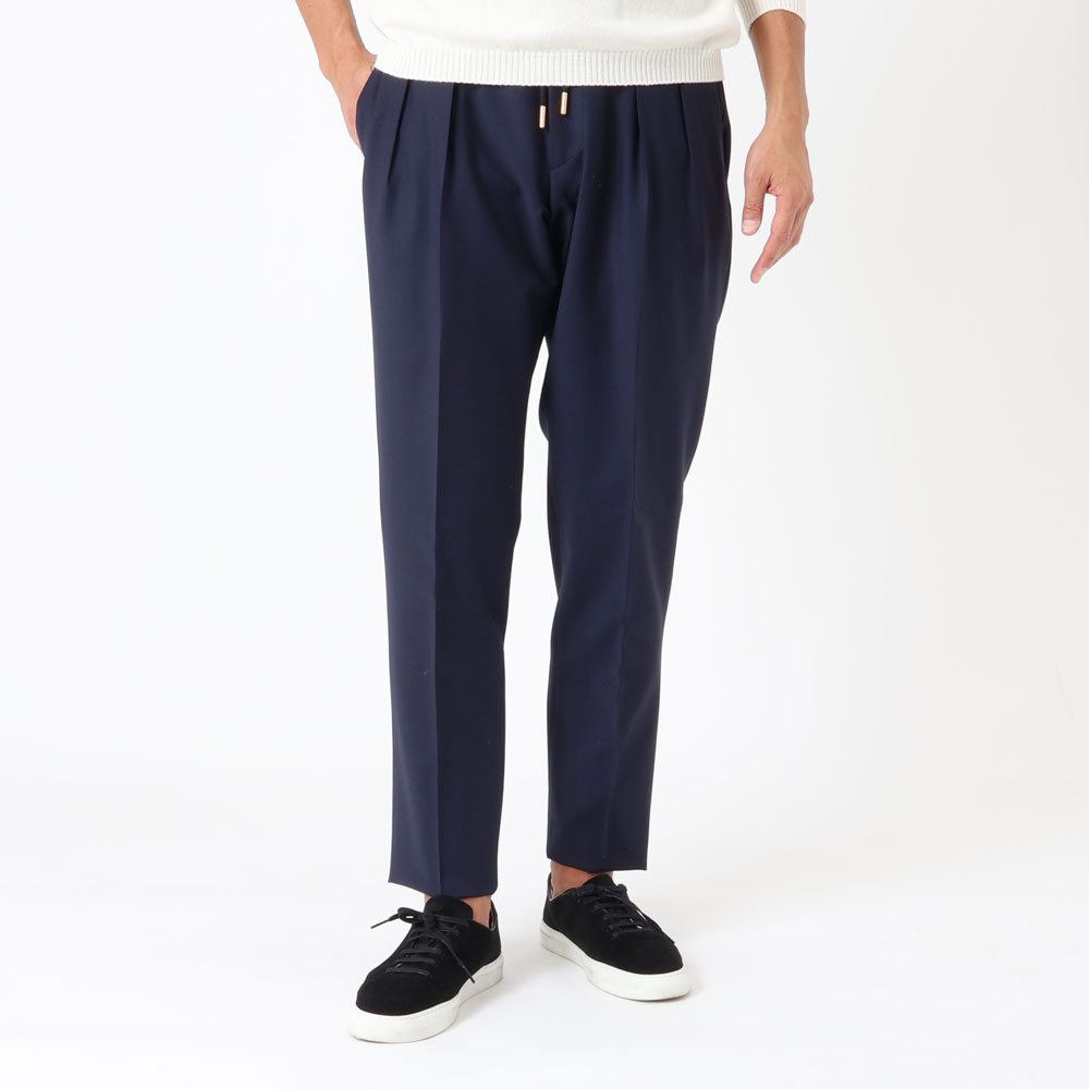 • ゴールドパーツ、2インプリーツ、ウエストサイドシャーリングゴム&ドローコード付き、前ポケット×3、後ポケット×2、フロントジップ、裾口アンフィニッシュ