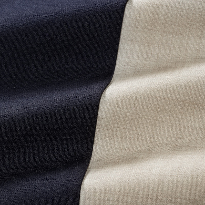 ・こちらはウール比率の高いポリウール素材。ハリとトロミが両立した風合いで、落ち感がよく、ドレープが綺麗に出る点が特徴。