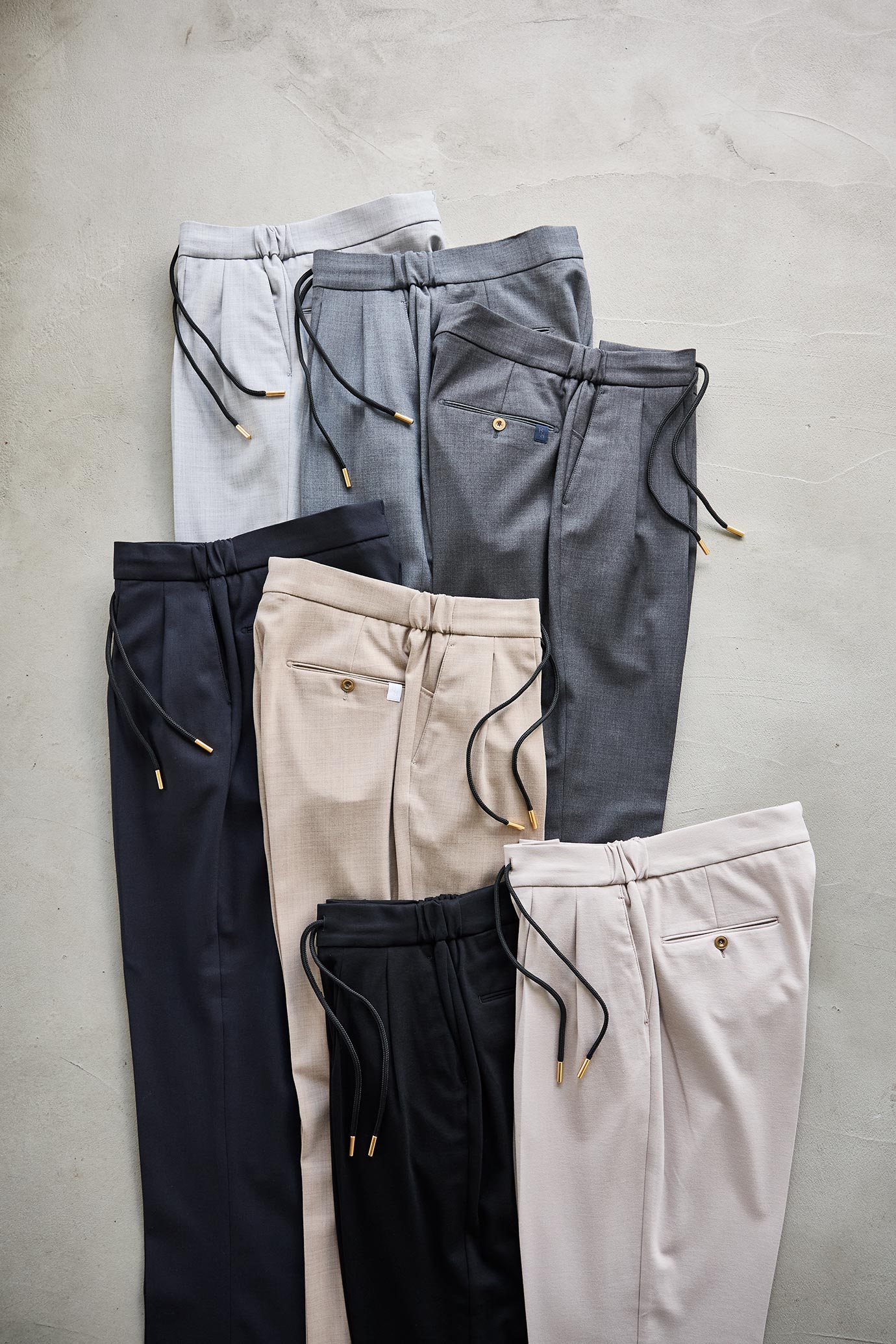 ・秋冬向けの生地ですが、サラッとした風合いのため春先まで穿けます。全7色(ブラック/ダークグリーン、ライトグレー/グレー/ダークグレー)をラインナップ。