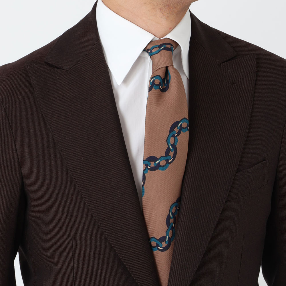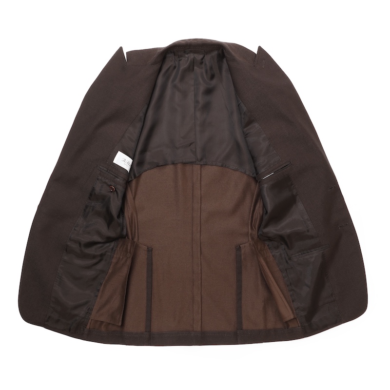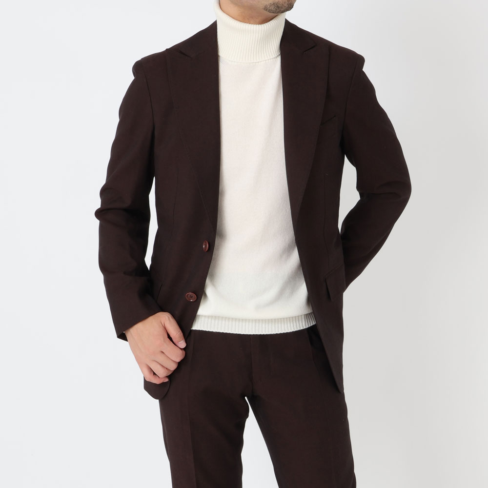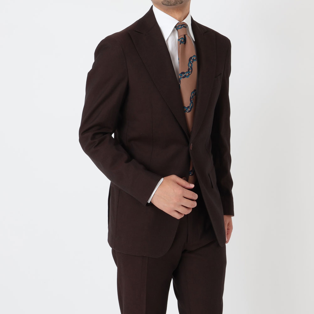 ・ジャケットのモデルはハーフキャンバス仕立て2つボタンでピークドラペルの"MERGELLINA"。シングル仕立てのピークドラペルは少し個性あるデザインになりますが、ダブル仕立て4つボタンくらいの感覚で、お洒落スーツとしてお楽しみ頂けます。