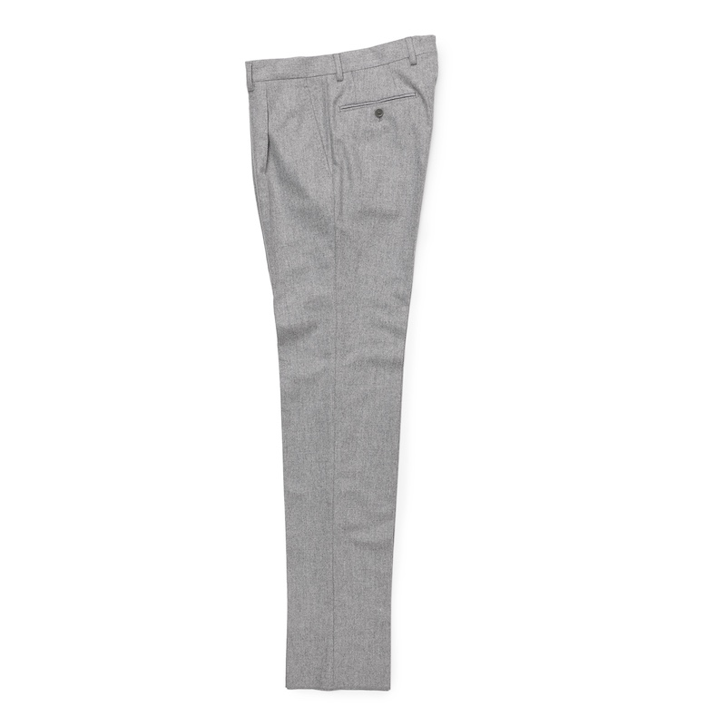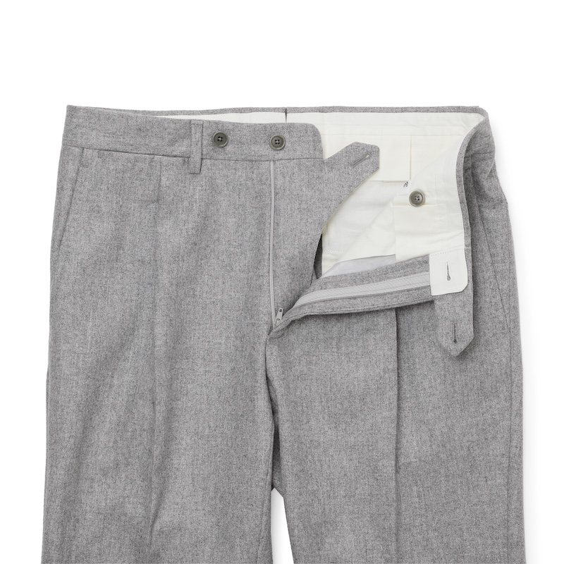 ・清潔感ある色合いが目を惹くウール100%のライトフランネル。目付けは340グラムと軽めで起毛感も控えめ。フランネルながら重厚感のない色合いゆえに秋口から着用できます。