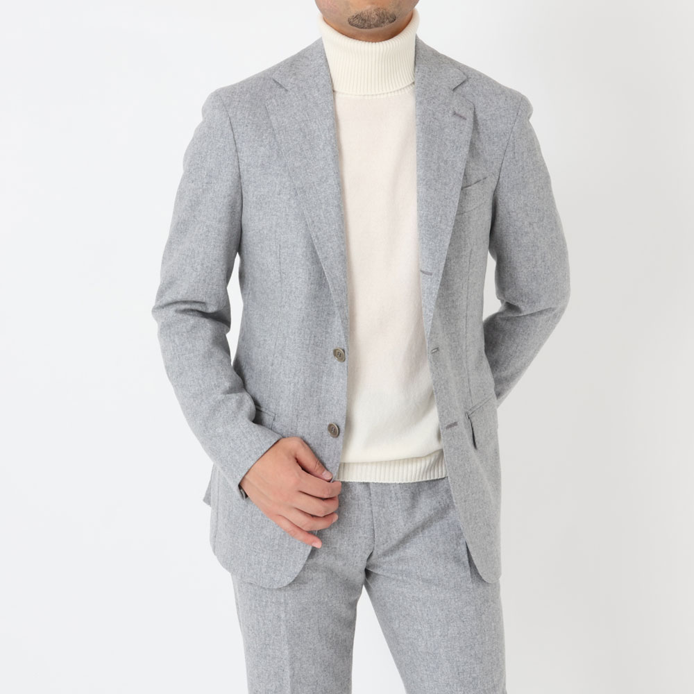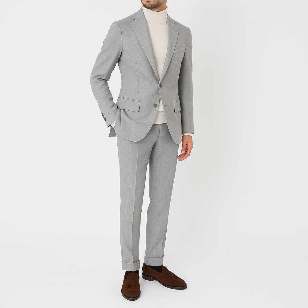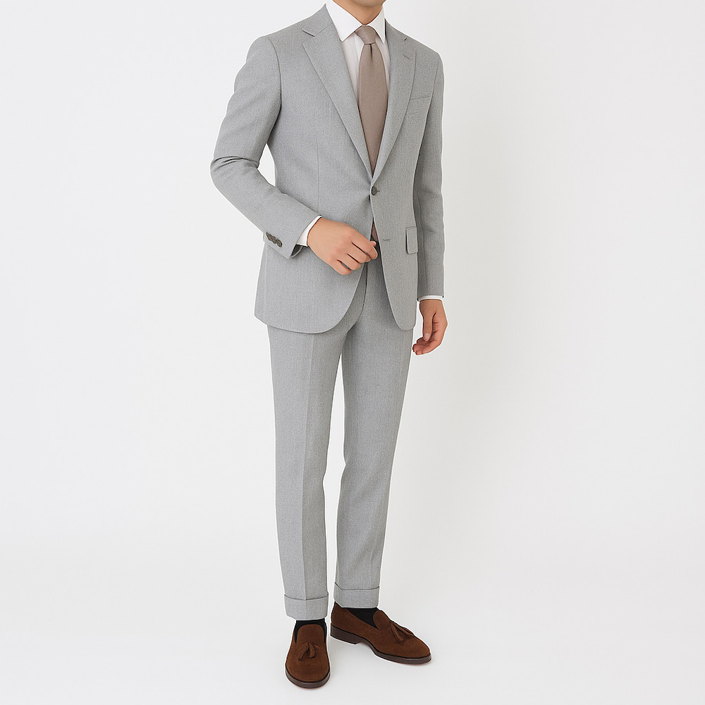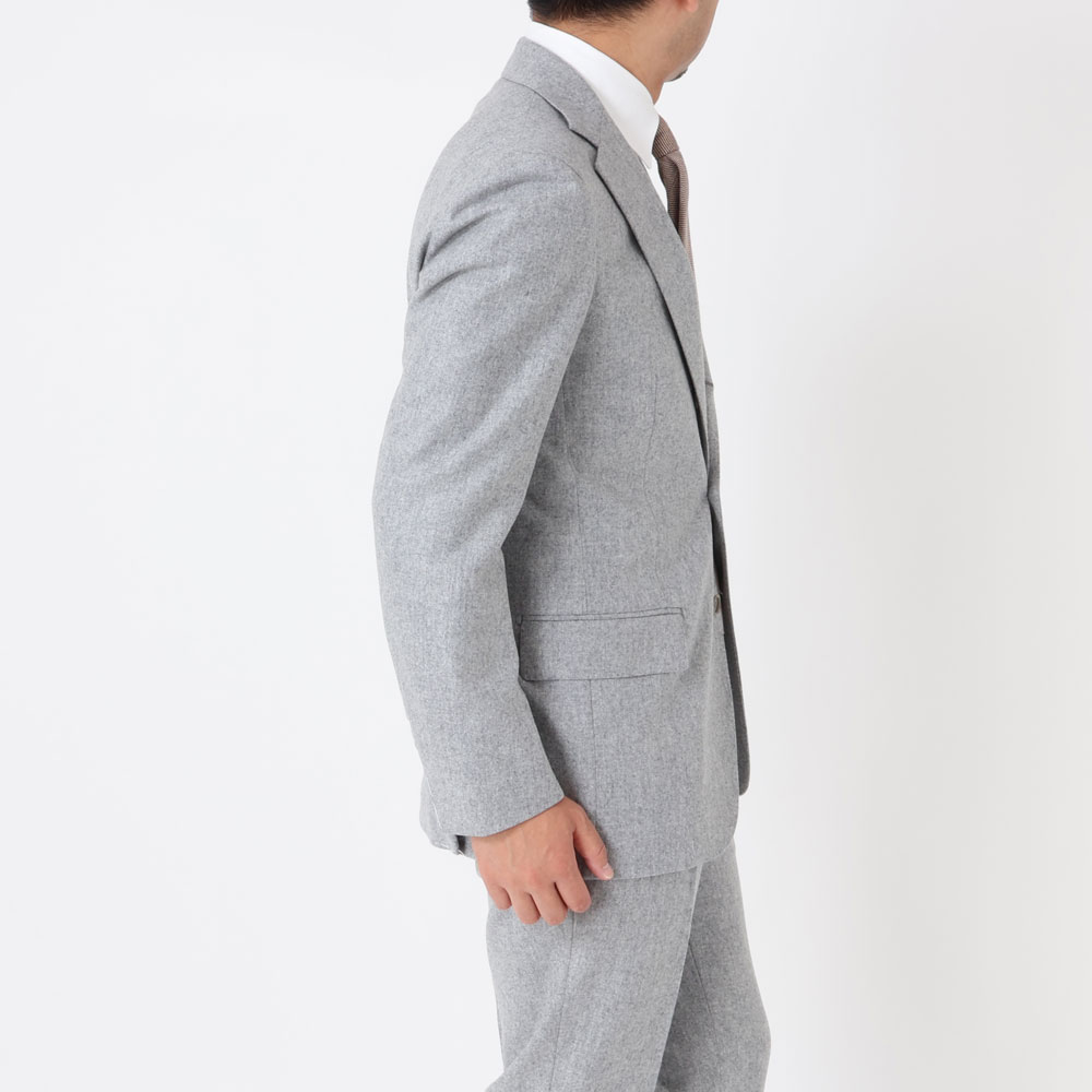 ・秋冬物のスーツで淡い色合いを選ぶのはちょっと勇気がいるかもしれません。でも生地が秋冬スーツの定番フランネルであれば安心。着るだけでちょっと洒落て映るライトグレーのフランネルスーツは3着目辺りでお試し頂くのがオススメです。