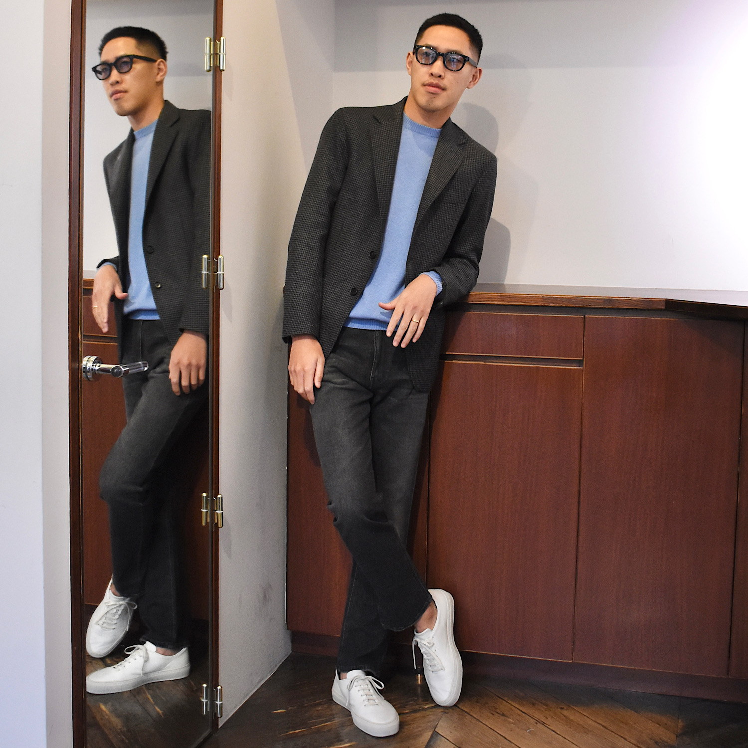 ジャケットや短めのアウターに合わせることを考えると、ワンサイズ下げて48を着ても窮屈さはなく、すっきりとした印象で着られそうです。