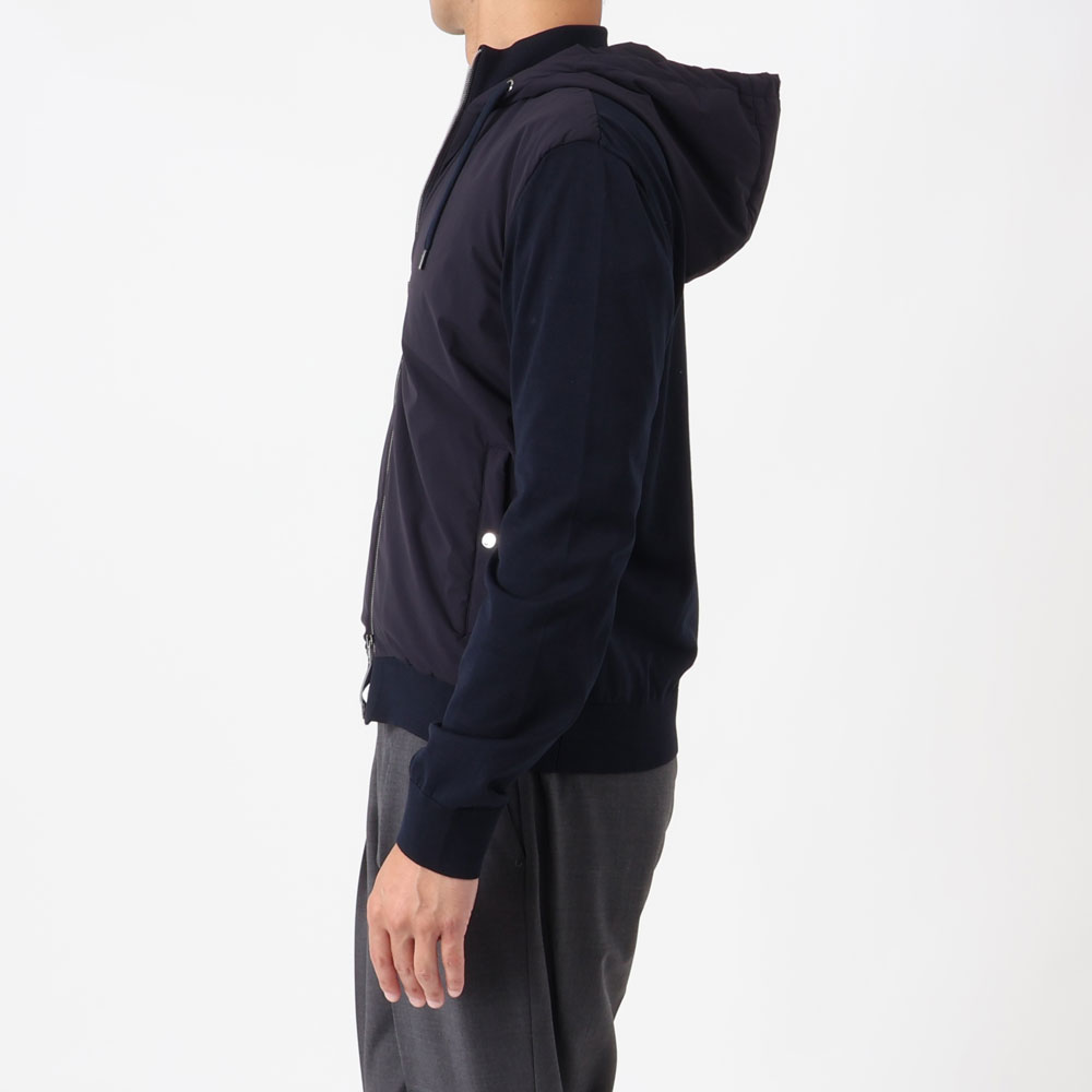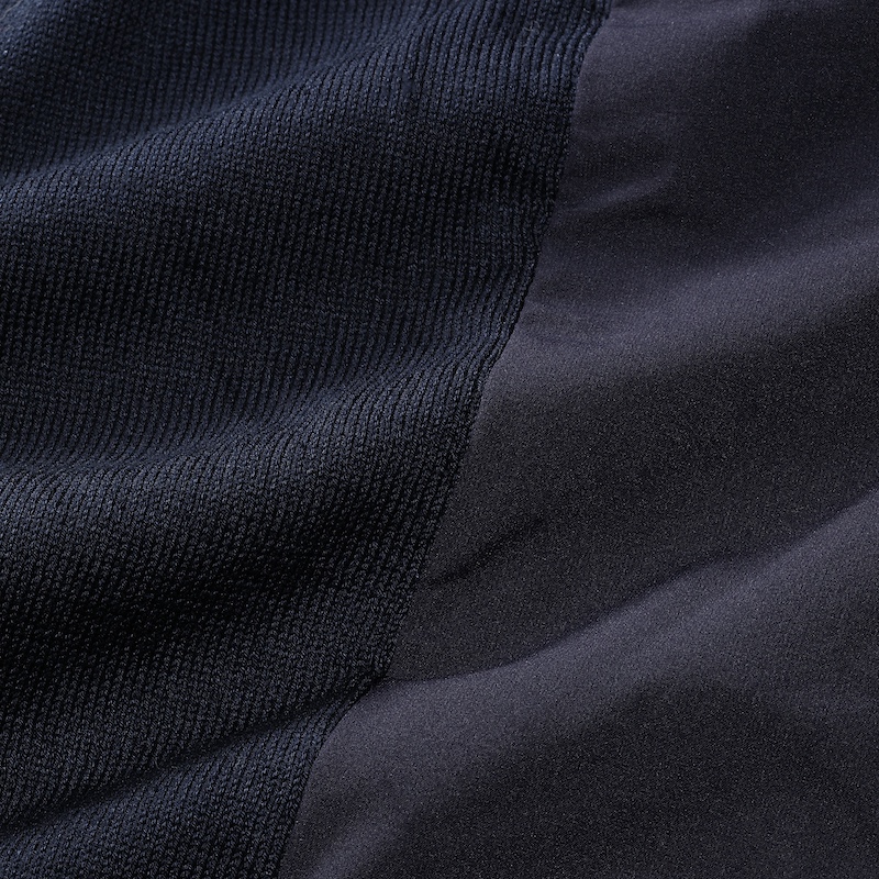 ・前身頃とフードには薄く中綿が入り、ストレッチナイロンを採用。袖と後身頃には薄手のコットンニットが配された異素材コンビネーションにより、夏以外は着用可能な一着。全面的にストレッチ性があり、シルエットはクセがなくスタンダード。軽量な点も特徴です。
