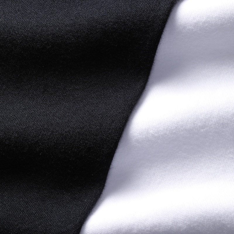 ・素材は両面編み(インターロック)のジャージー。肌触りがとても良く、伸縮性も抜群です。後染めゆえの馴染みのよい生地感で快適な着心地をお約束します。