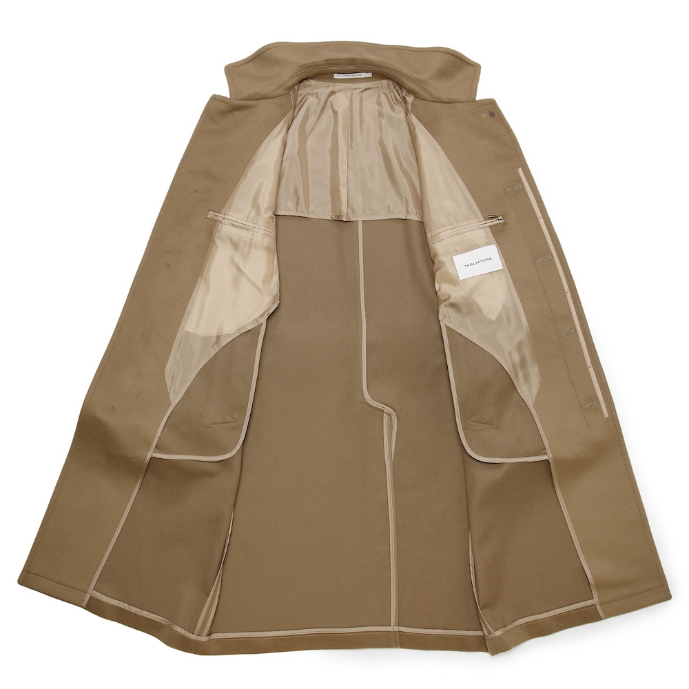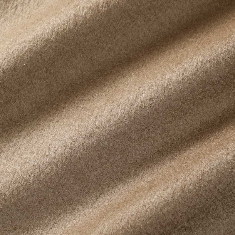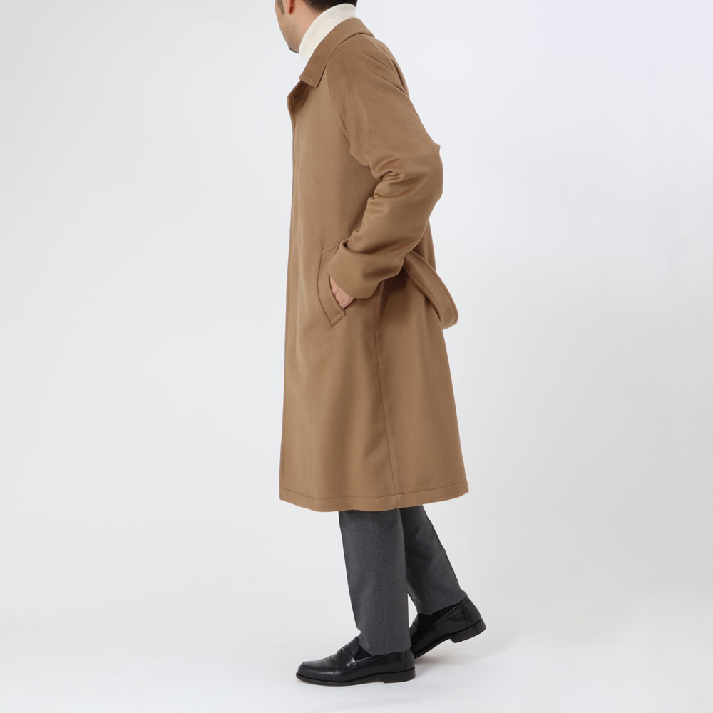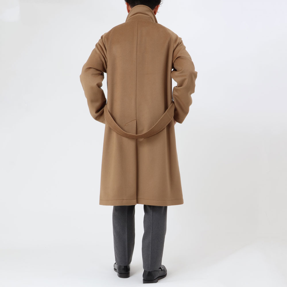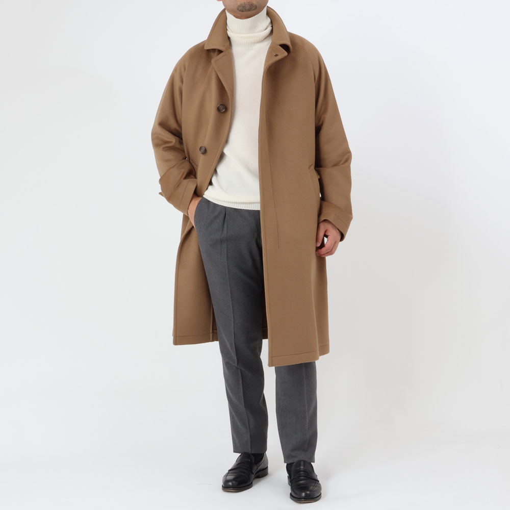 ・目付けは595グラムとコートらしい量感のある生地はヴァージンウール100%。毛足がビーバーのように整えられた綺麗な風合い、柔らかな手触りが特徴です。2色(キャメル/ダークネイビー)のラインナップ。