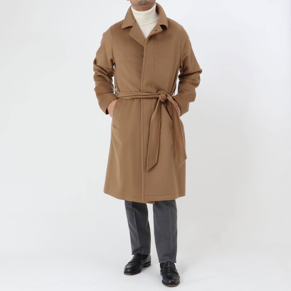 ・ラグランスリーブ、フライフロントとベーシックなデザインのバルカラーコートながら、それに加えられたベルテッド仕様が「TAGLIATORE(タリアトーレ)」らしいところ。ウエストを絞ってグラマラスに見せることはもちろんのこと、無造作に腰ポケットに入れたり、ベルトがあるだけで着こなしの幅が広がります。