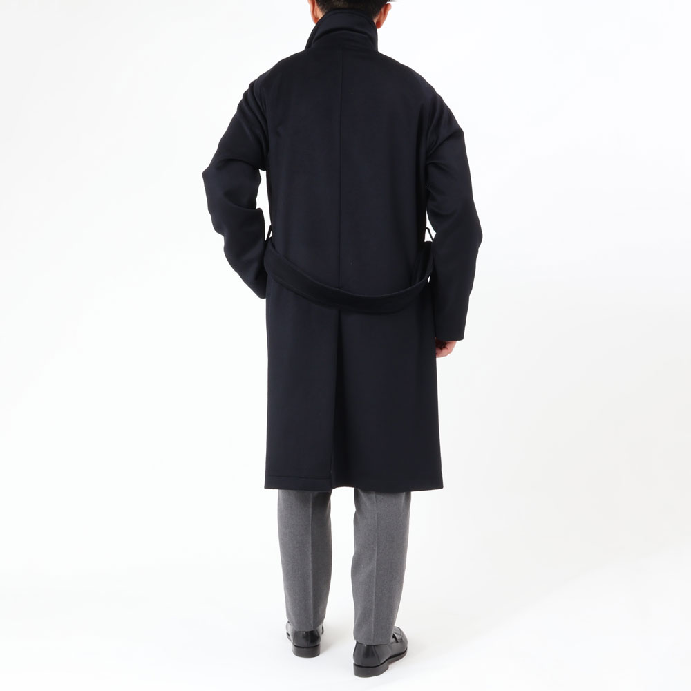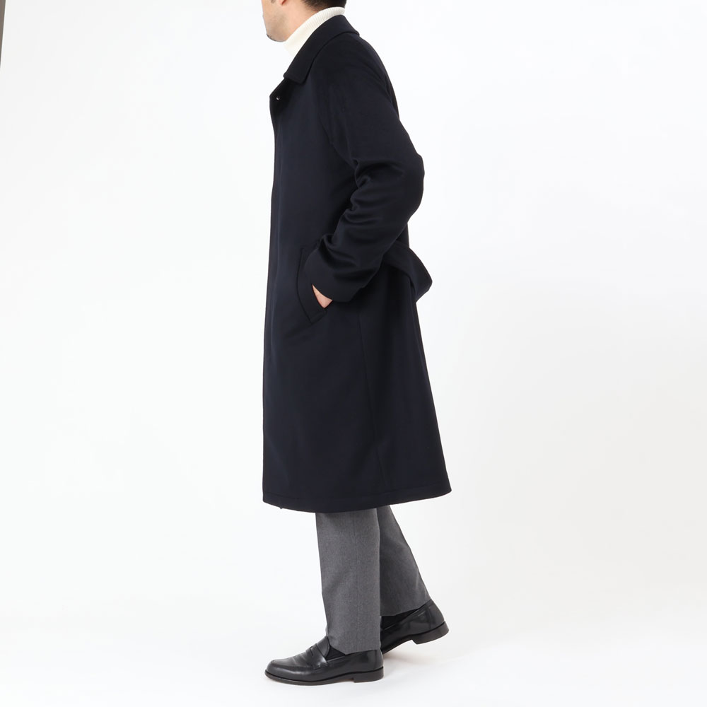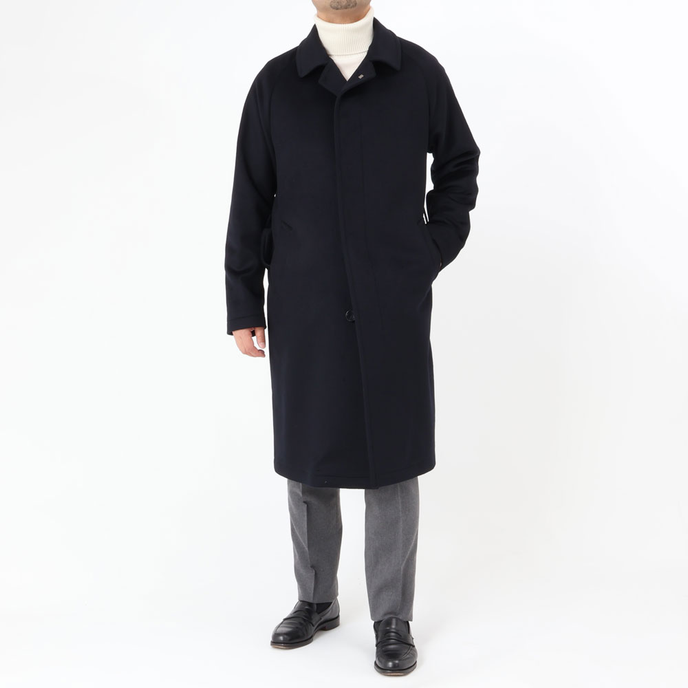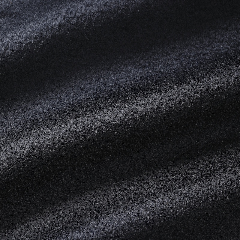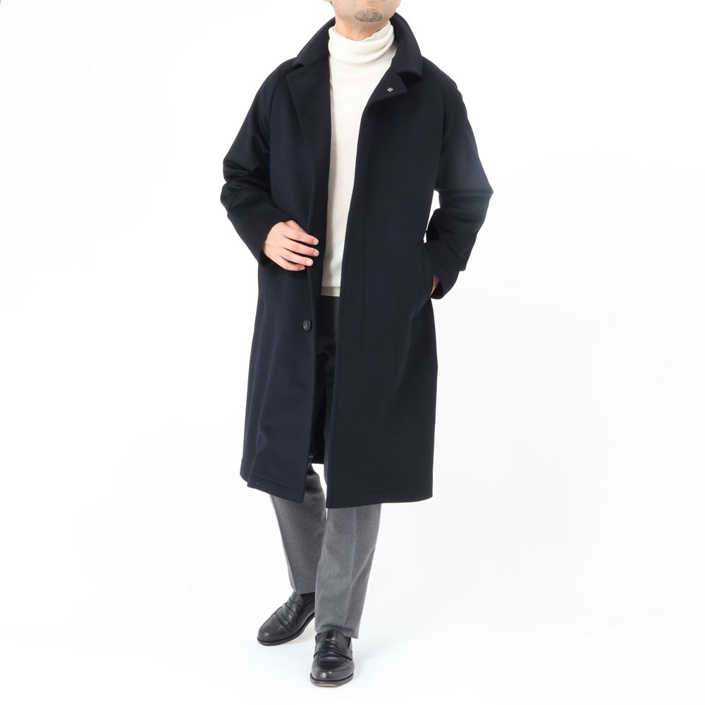 ・目付けは595グラムとコートらしい量感のある生地はヴァージンウール100%。毛足がビーバーのように整えられた綺麗な風合い、柔らかな手触りが特徴です。2色(キャメル/ダークネイビー)のラインナップ。