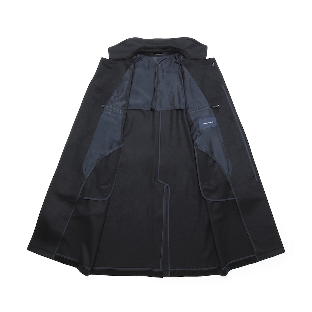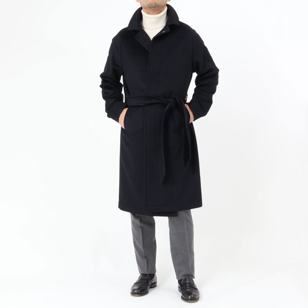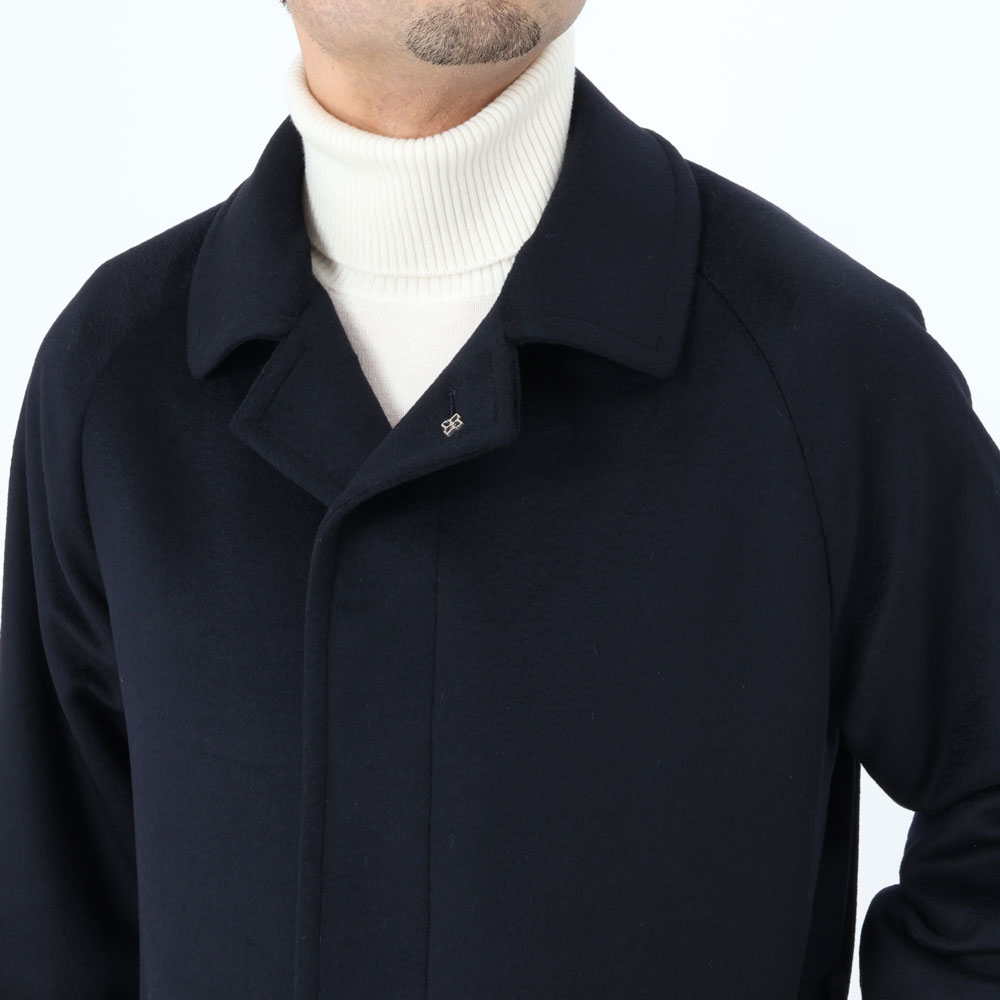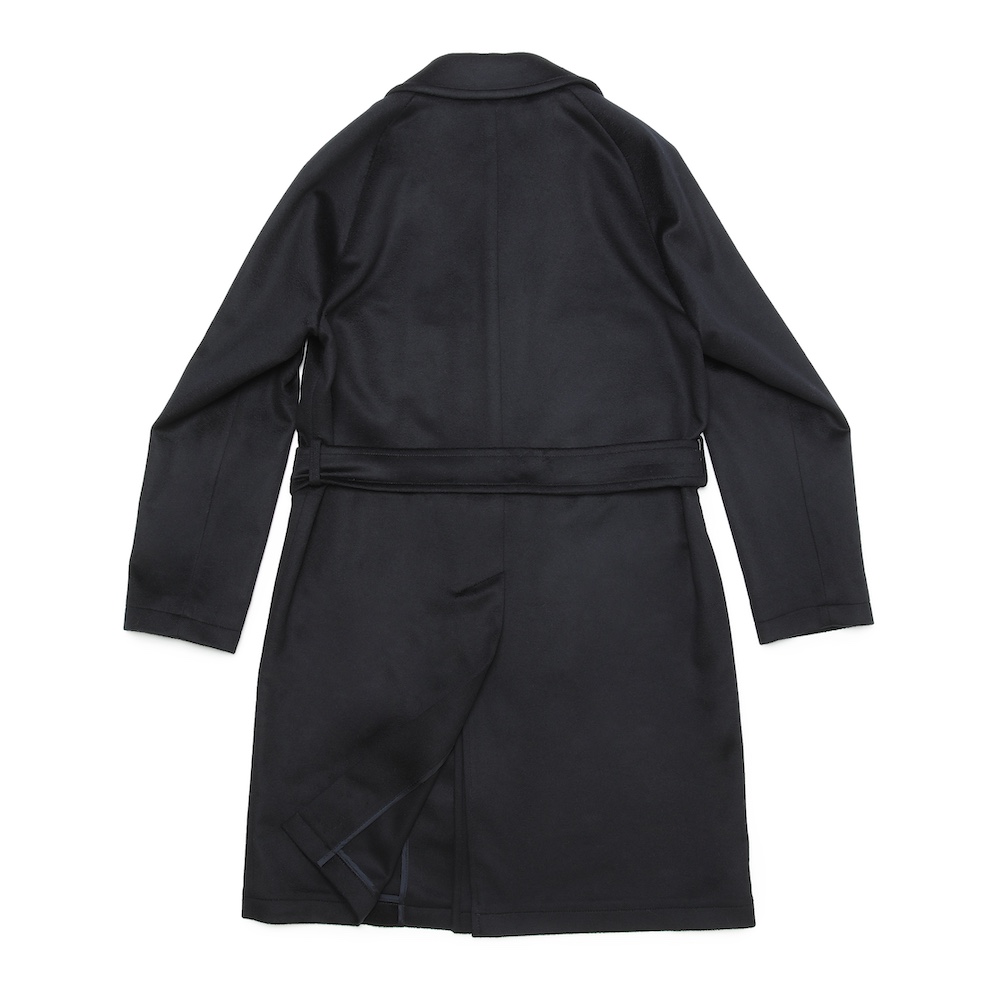 ・目付けは595グラムとコートらしい量感のある生地はヴァージンウール100%。毛足がビーバーのように整えられた綺麗な風合い、柔らかな手触りが特徴です。2色(キャメル/ダークネイビー)のラインナップ。