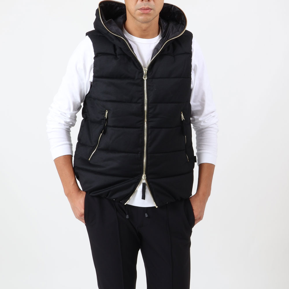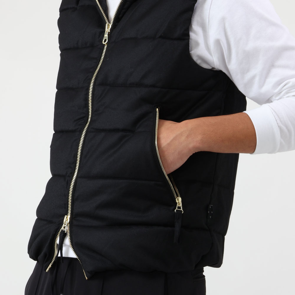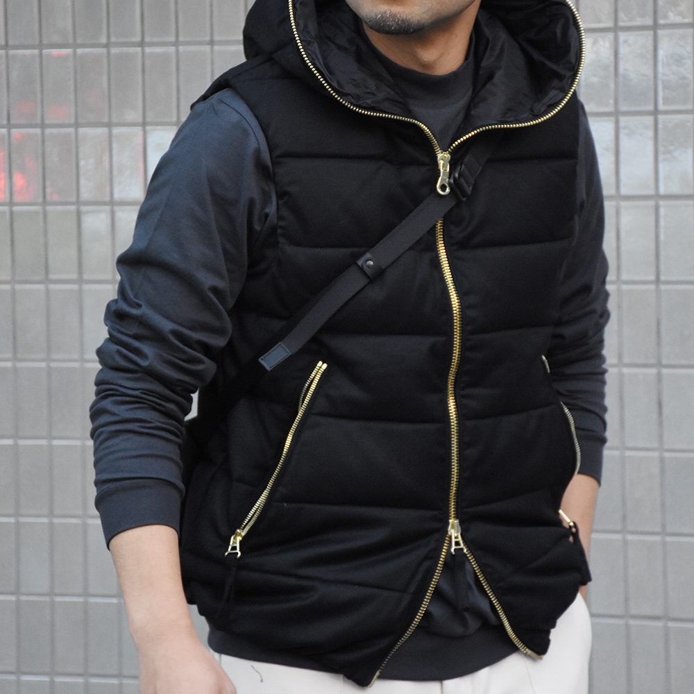 ・"PONZA(ポンザ)”はこのコラボレーションから生まれたダウンベスト。高品質なピュアグースダウンを使用し、まゆに包まれるような優しい着心地が特徴です。グレーとブラックの2色をラインナップ。