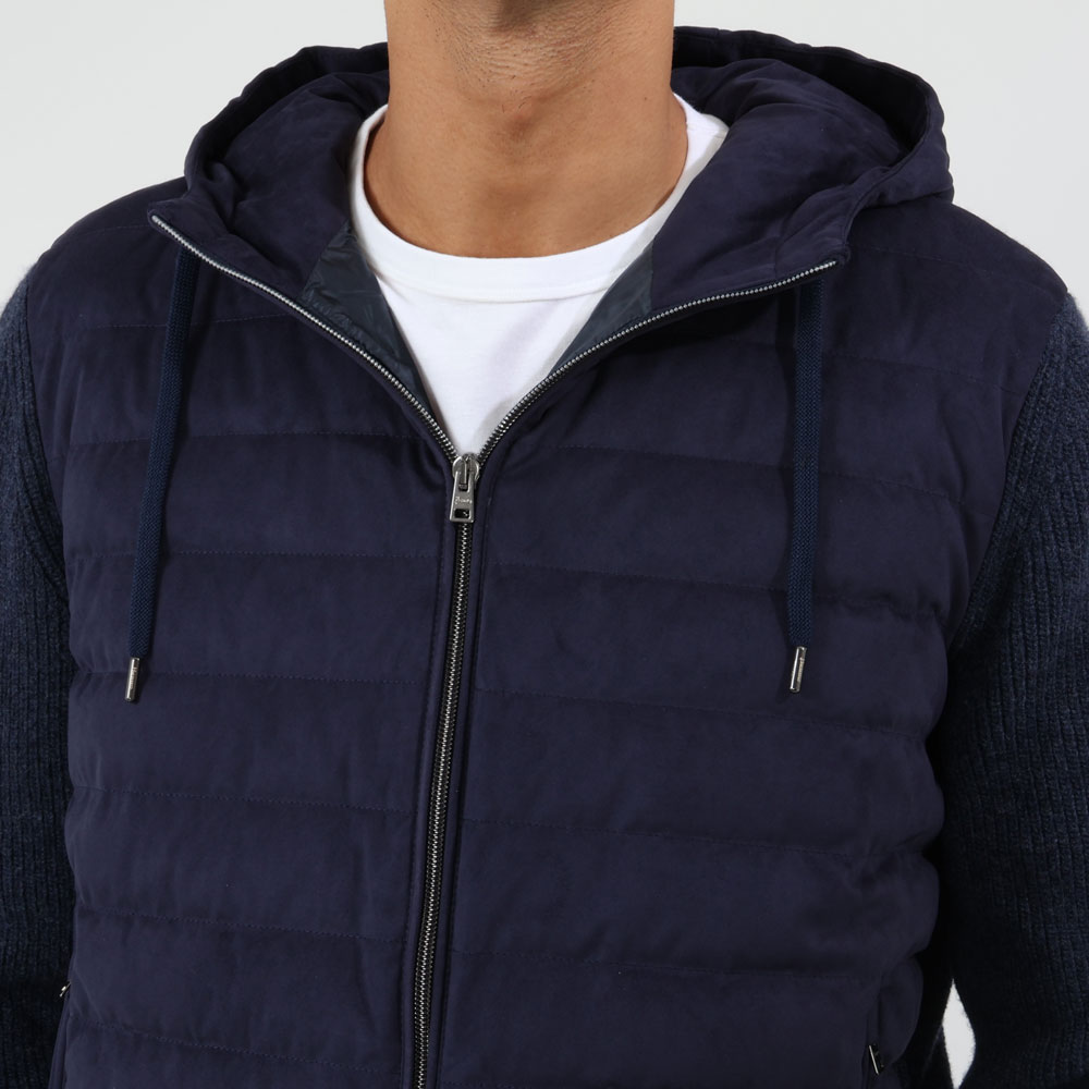 ・前身頃とフードには薄くダウンが入り、ポリエステルベースのスウェード調生地を採用。リアルスウェードにしか見えない高級感とストレッチ性を備えます。