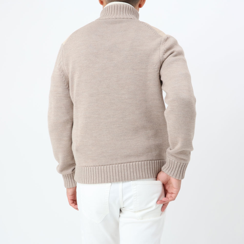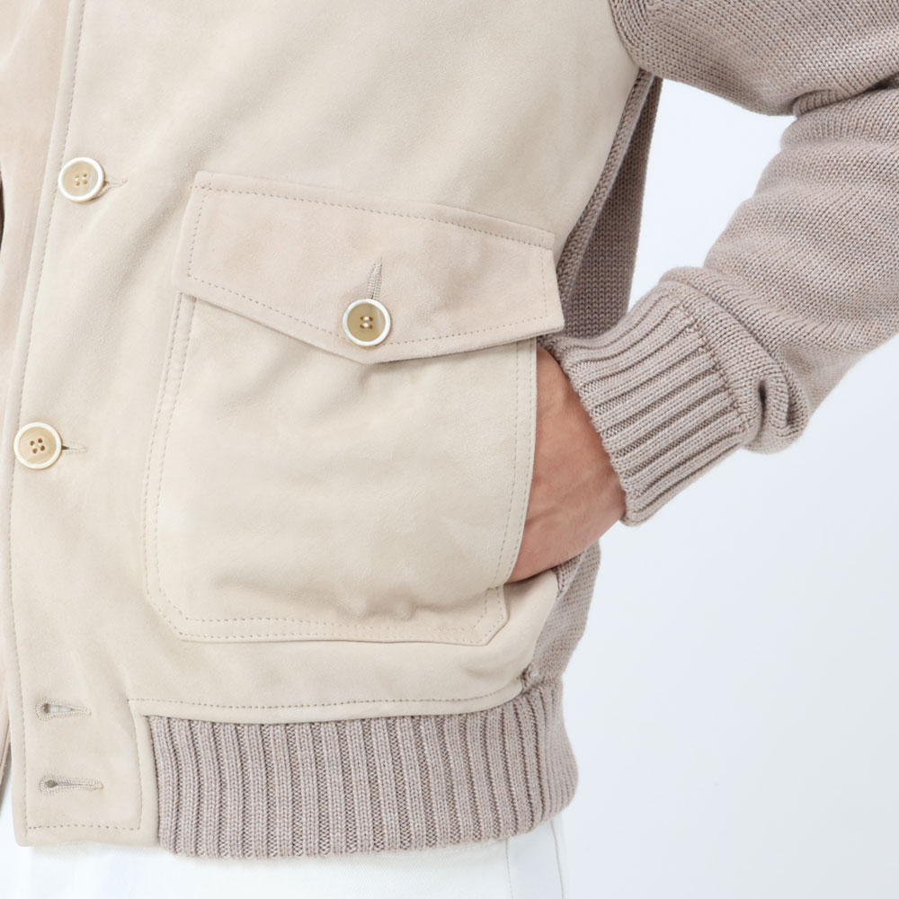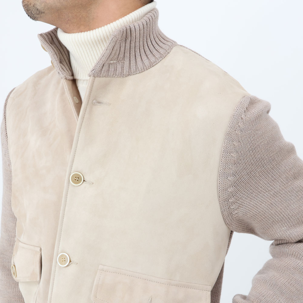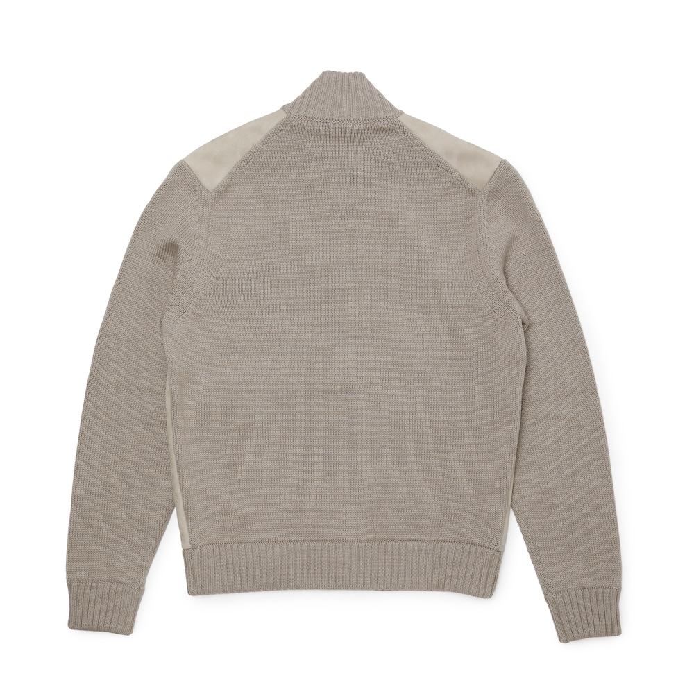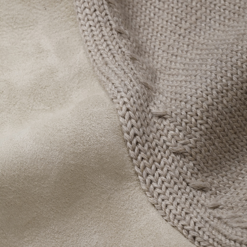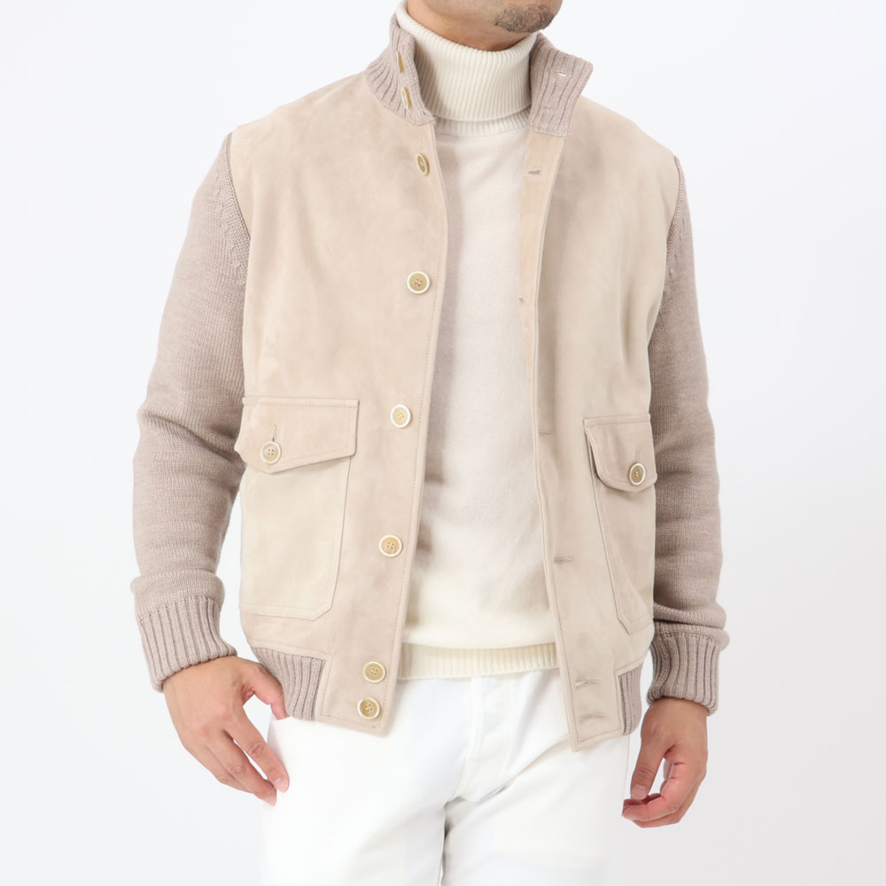 ・淡い色合いが上品なゴートスウェードと「ZANONE(ザノーネ)」定番ヴァージンメリノ5ゲージニットの組み合わせが見どころ。