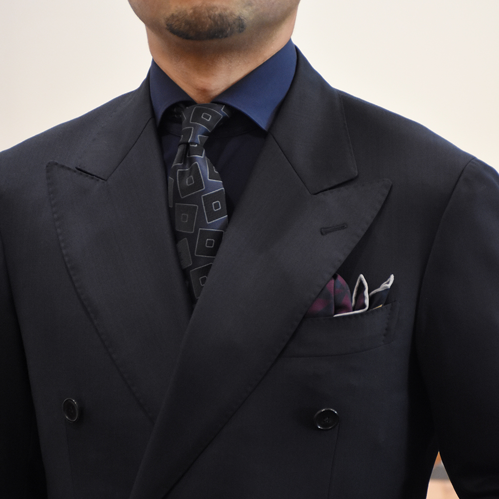 柄の存在感が引き立ちつつも上品且つモダンなVゾーンが出来上がります。加えて冷静さがあるような雰囲気も魅力の一つかと思いました。ハリを残しつつ程よく柔らかいため首元に優しくフィットし長時間つけていても疲れにくいです。