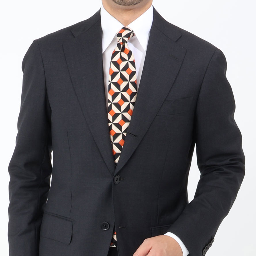 ・幾何学柄ががモダンな配色でまとめられています。2色ともに同柄のチーフもあるので、セットでギフトにも。