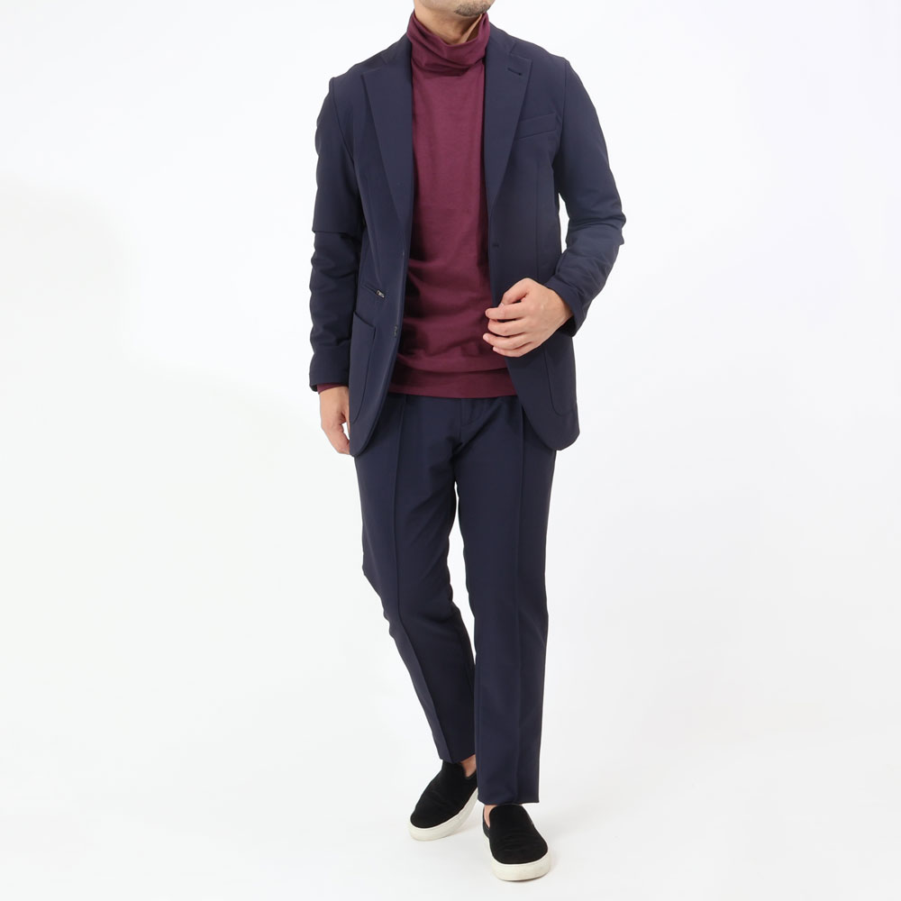 ・スタンダードなラペル幅、甘めに入れられたウエストシェイプ、ほどよい長さに設定された着丈によりシャープで軽快感のあるシルエットです。