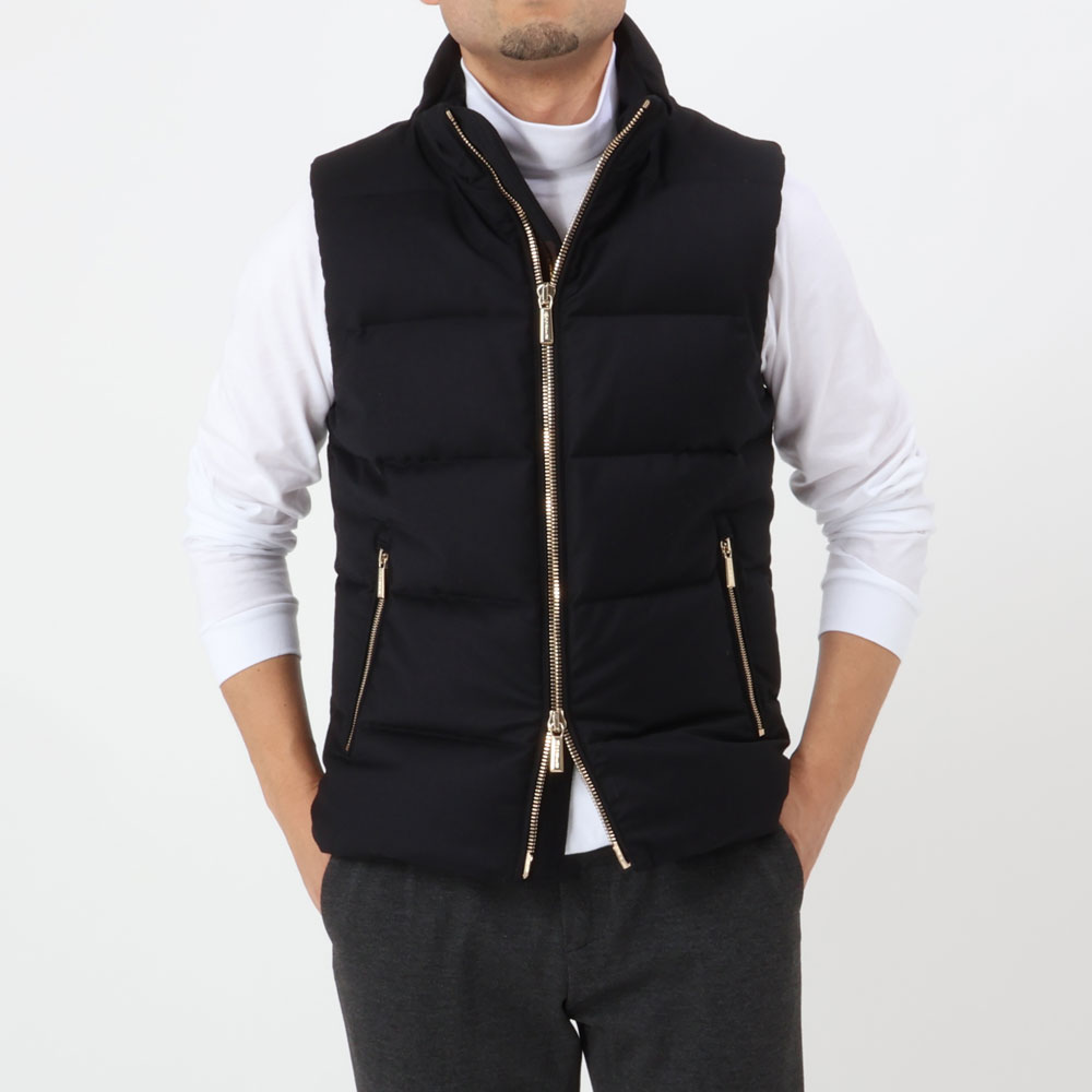 ・このスペシャルな別注に際して、BRがセレクトしたモデルは定番ダウンベストの”FIRE(ファイヤー)”。気候変動を加味し、なるべく長く着られ、 ゴールドパーツが活きるカラー”NERO=ブラック”にこだわり、昨年よりもシェル(表地)をアップグレード。