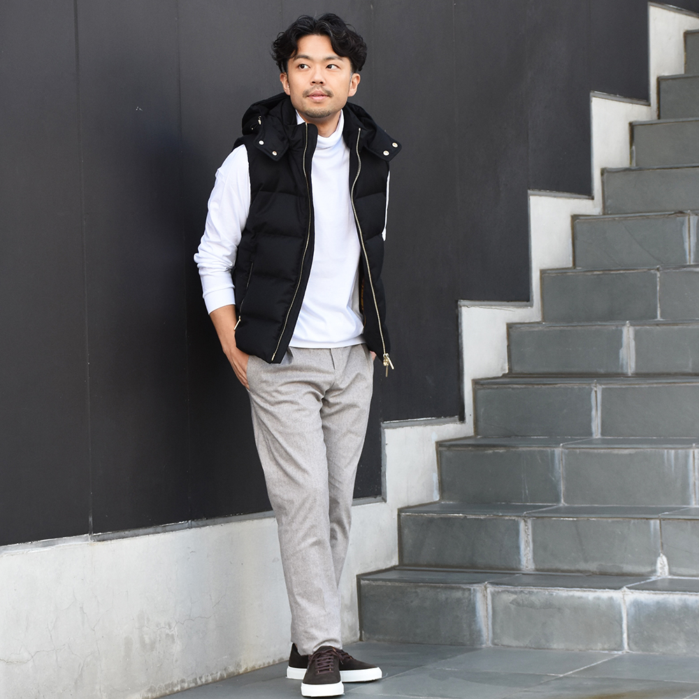 ・もちろんダウンのクオリティは折り紙付き。最高レベルのフィルパワーを誇るグースダウンを使用し、極めて高い保温性を実現。まるで温かな空気を纏っているような着感です。
