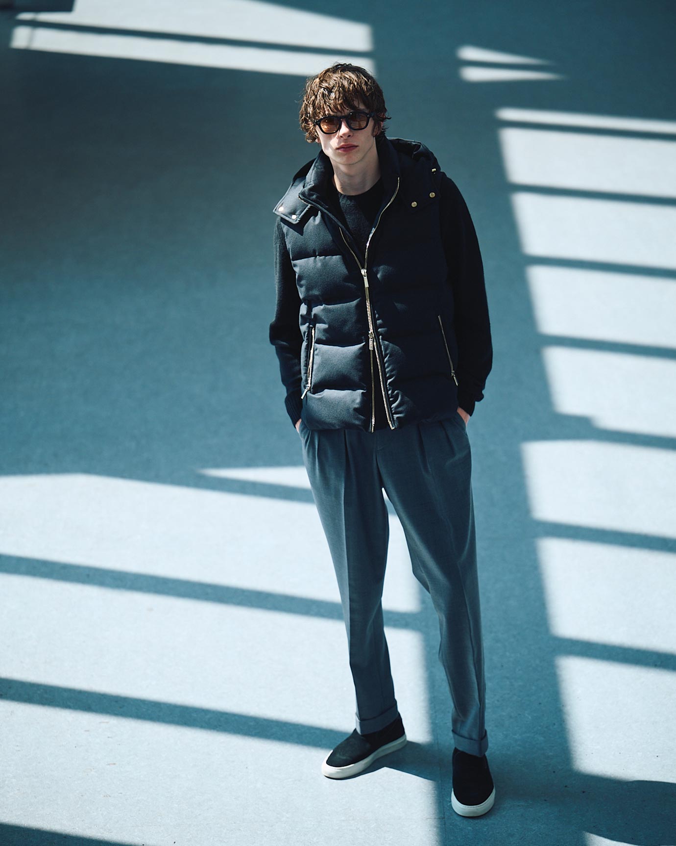 ・スポーティさが抑えられたフランネルの風合いとゴールドパーツがマッチし、唯一無二の一着に。ちなみにLLは生地名で、その後の”O”はOro=イタリア語で”金”の意味。