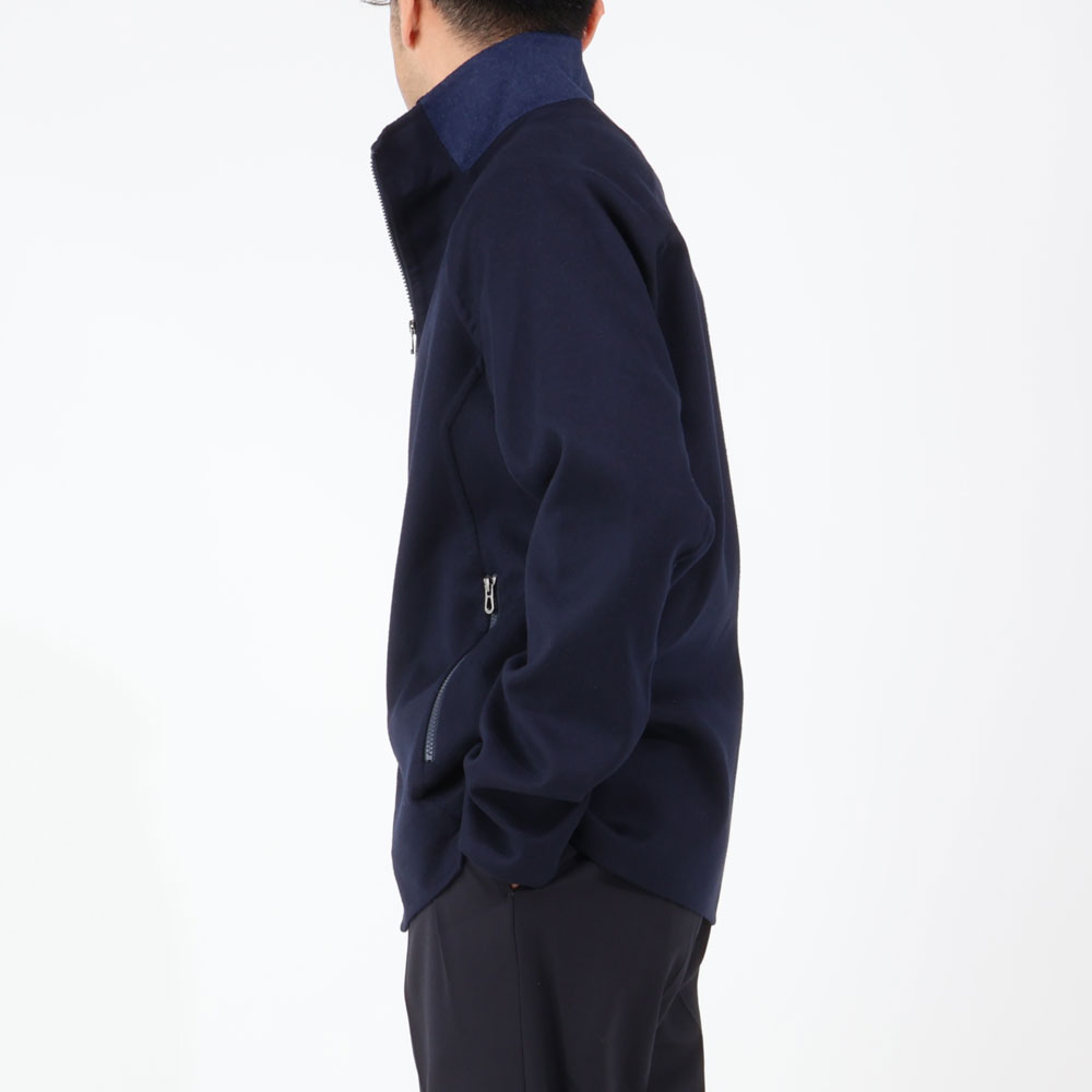 ・トップまでジップを上げずにスタンドカラーを開いたり、袖を少し折り返すなど、上品な配色を活かした着こなしがオススメ。