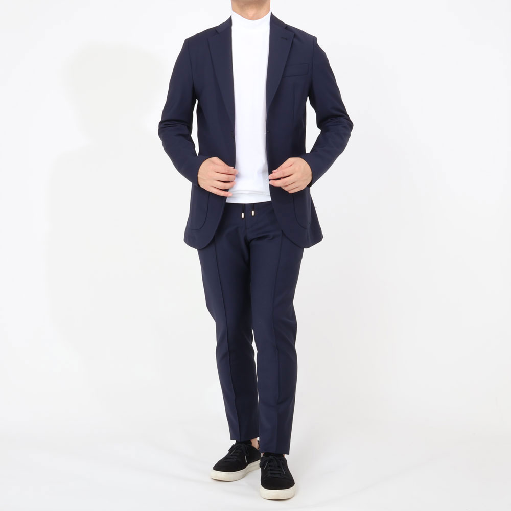 柔らかなタッチにほんのりとした光沢感、ハリ・コシがある生地は端正な印象、オンオフ問わず活躍するジャケットです。シワになりにくいので長時間の移動でも安心して穿けます。44サイズを着用しウエスト周りは丁度よく全体的に細身のフィッティングでした