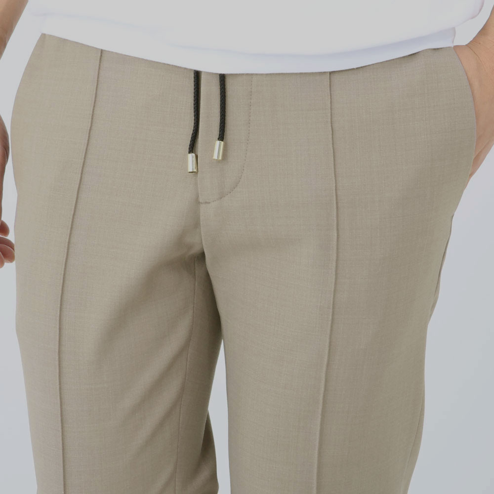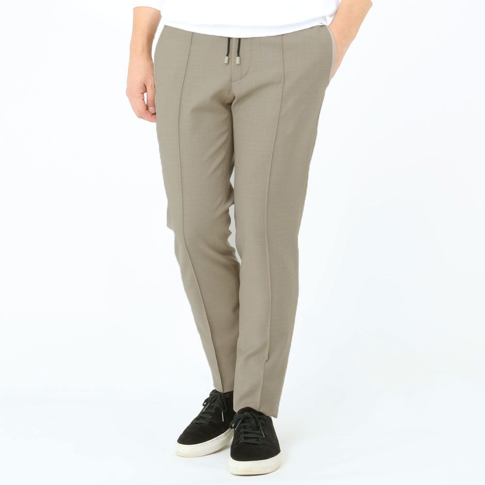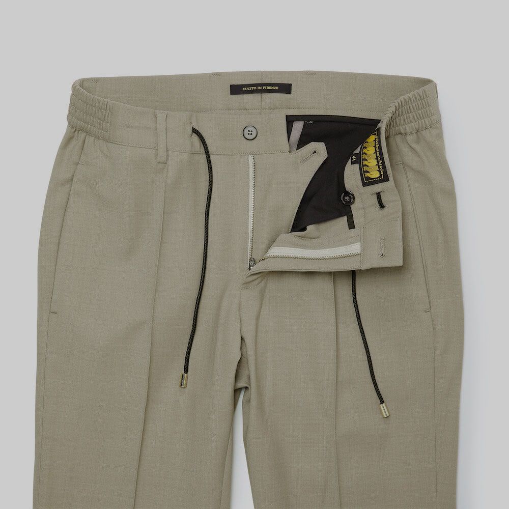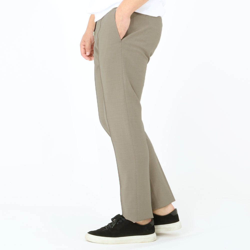 ・生地は杢調の複雑な色合いが美しいウールベースの平織りストレッチ素材である”TOP WOOL TROPICAL”。今シーズンのコレクションの中でも抜群のハリ感とトロみを併せ持ち、シルエットを綺麗に引き立たせます。