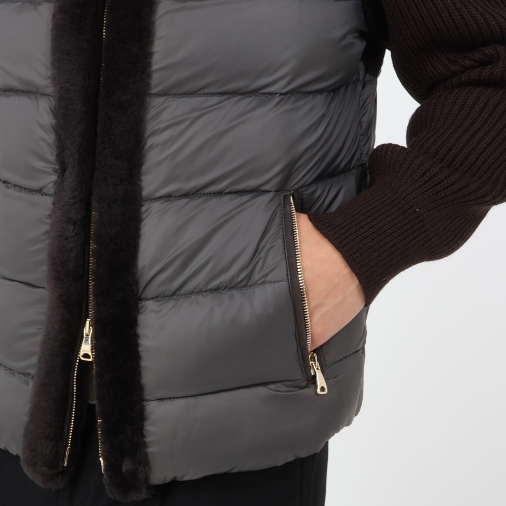 エンメティならではの上質なムートンとダウンのコンビネーションでデザイン性に優れた一着。カットソーやニットの上にさらっと羽織るだけで、あれこれ悩まずとも洒落感のある大人のコーディネートが完成。ラグジュアリー感がありながらも日常使いしやすいのが魅力です。ニットの上から44サイズを着用して、身幅・着丈ともにちょうど良いサイズ感でした。