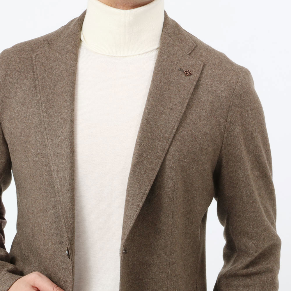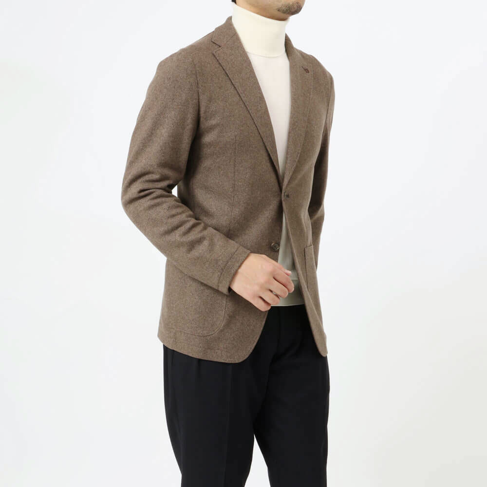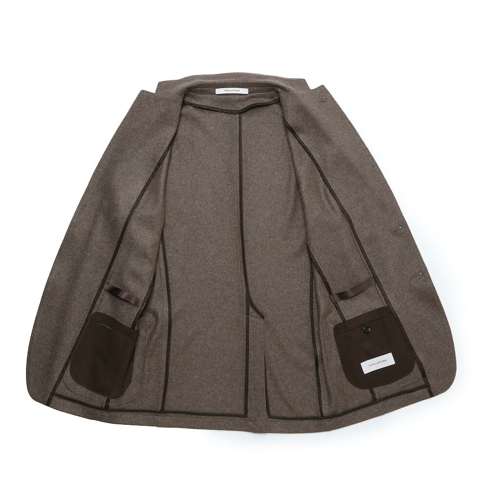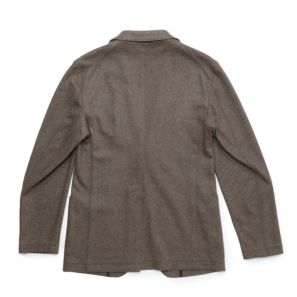 ・形状保持と立体感、そし着心地を良くするためにジャケットのキモとも言える襟と(前身頃の)見返し以外は一枚仕立て。裏地と胸ポケットを省き、筒袖が採用されています。袖丈が合えば、お直し無しで着られるお手軽な一着。極めて軽く柔らかな着心地が特徴です。