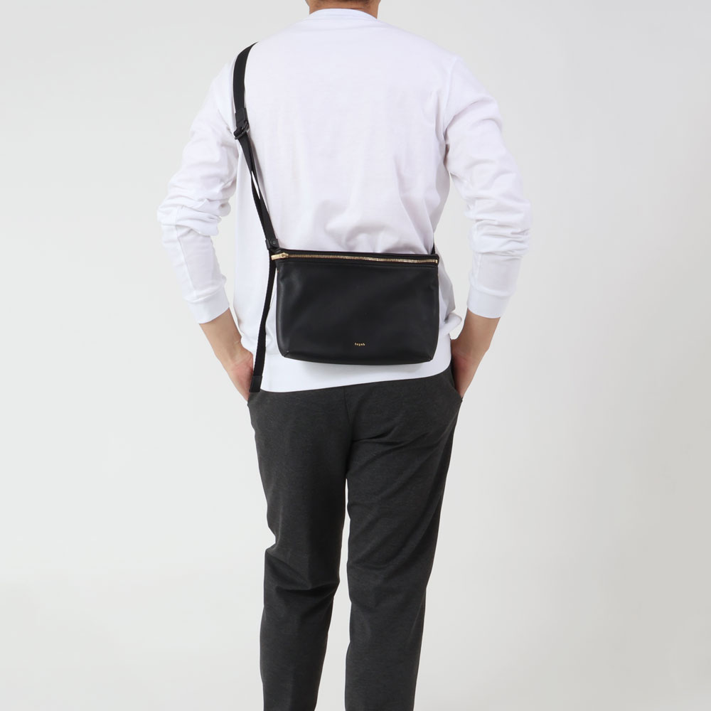 iPad mini くらいのサイズ感。内側には小物を整理しやすいポケットが2つあり、収納力も◎。旅行先やちょっとした外出時に、身軽に動きたいシーンで活躍してくれます。ストラップの先端にもレザーを使用しており、細部まで高級感のある仕上がりです。きれいめカジュアルスタイルに合わせやすい大人のショルダーバッグです。