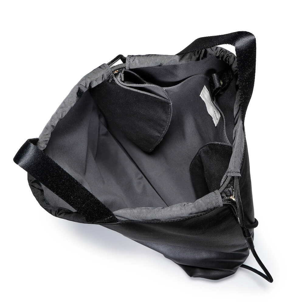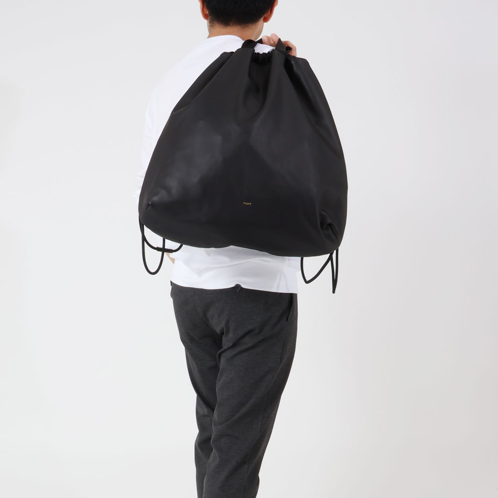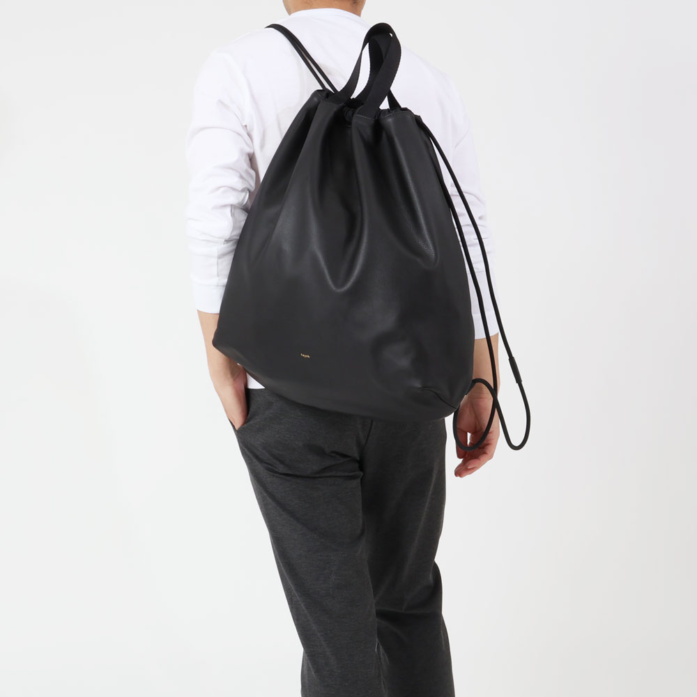 ・上部の入口を絞らなければ、端正なトートバッグとしても使用可能。本来スポーティで子供っぽい印象を与えるナップサックタイプを、上質なキップレザーとソリッドなシルエットで構成することでシックなスタイルに合わせられるプロダクトに仕上げられています。