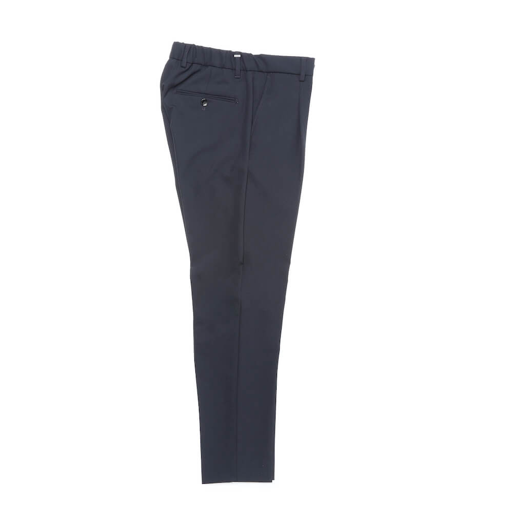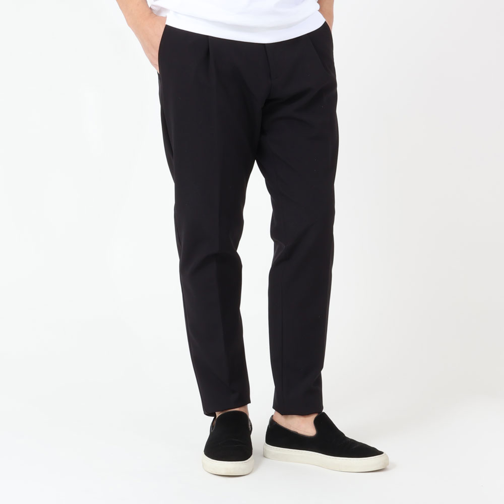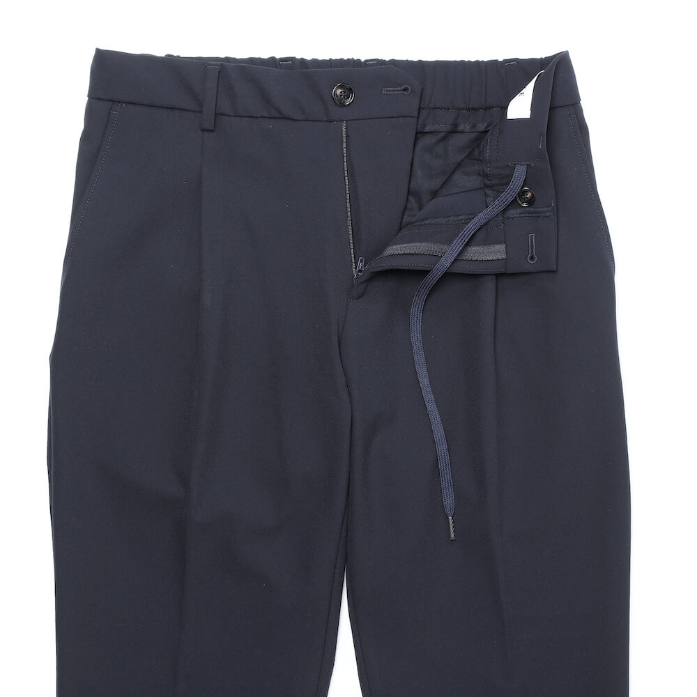 ・パンツのモデル”RICCARDO”は、1アウトプリーツでウエストバックシャーリングの内通しドローコードといったディテールに加え、やや余裕のあるワタリから急激にテーパードするシルエットが特徴です。