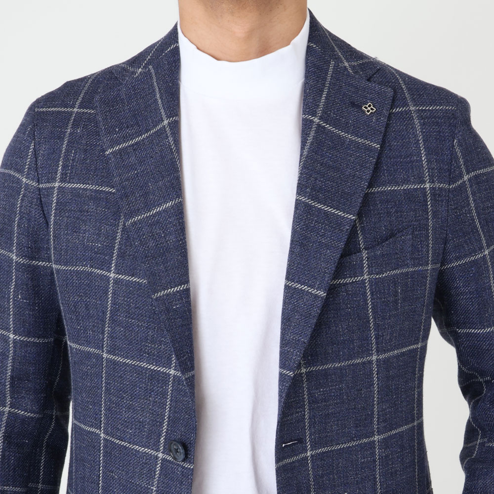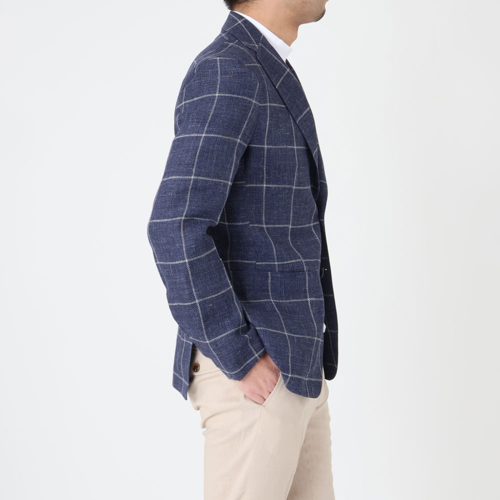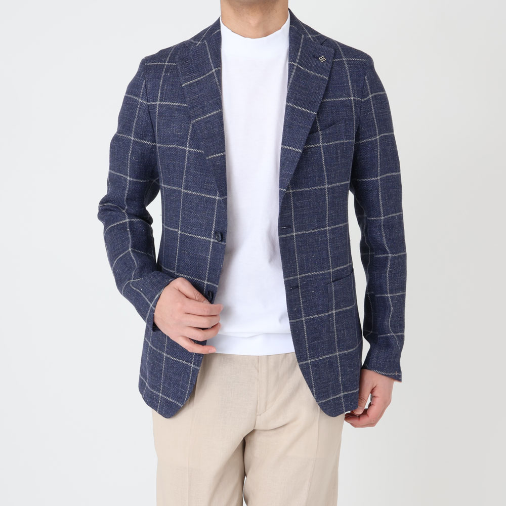 リネンの軽やかさとウインドウペンの存在感が絶妙に調和した一着。決して派手にならず“余裕のある大人の洒落感”を演出し、コーディネートを引き立ててくれる頼れるジャケットです。シャツや薄手のニット、カットソーの上からサイズ44を着用し、ジャストなサイズでした。