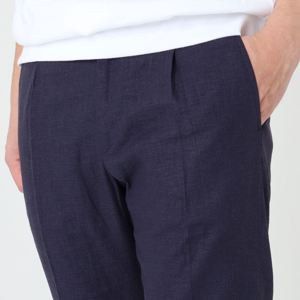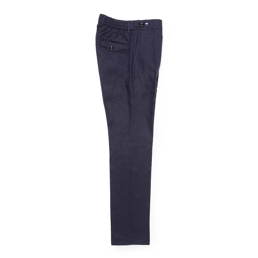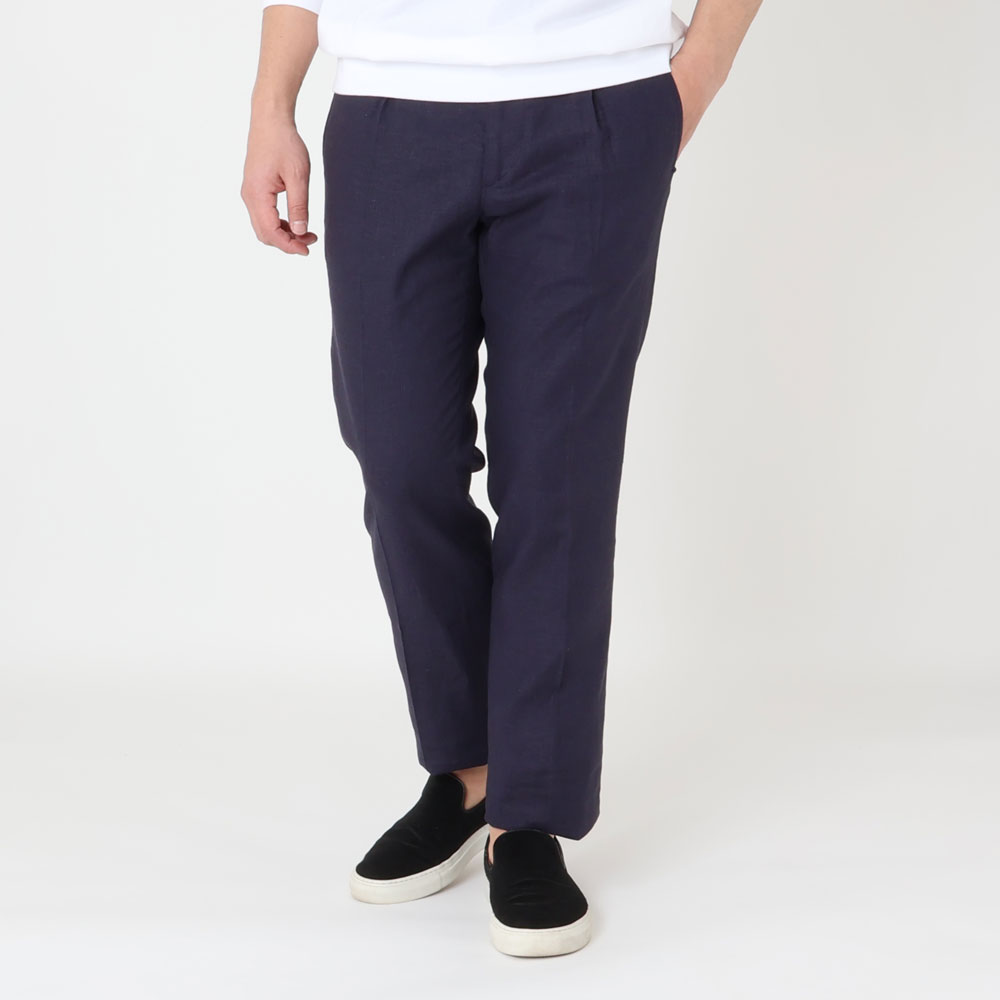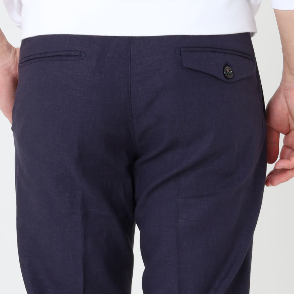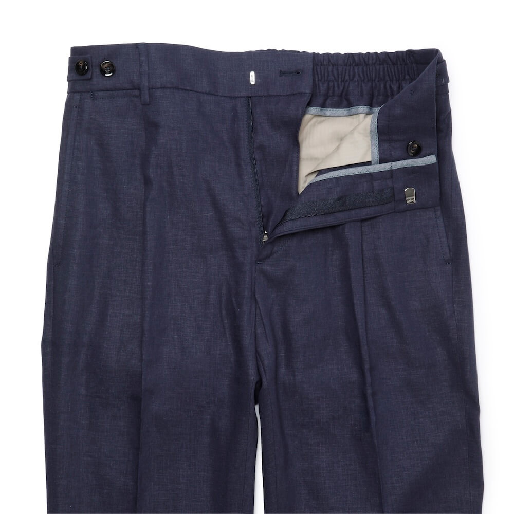 ・生地はリネンとヴィスコース(レーヨン)がブレンドされたキャンバス織り。薄手でリネンの清涼感とヴィスコースのトロみを持ち合わせており、夏向きの涼しい穿き心地です。全4色(ライトベージュ/グレージュ)のラインナップ。