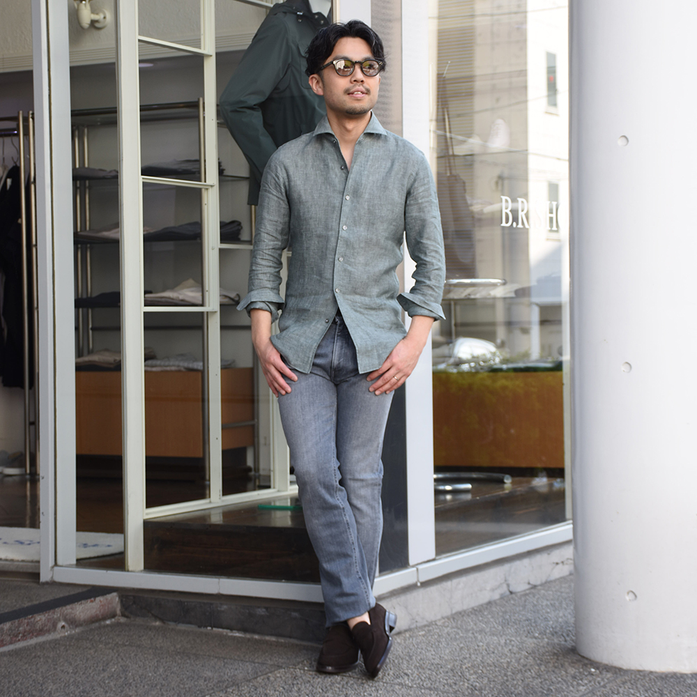 ・モデル”BRICE(ブライス)”のデザインは、少し目尻に向かって垂れたようにすることで抜け感を作ったウェリントンシェイプをベースに、一般的なアセテートではなく希少なセルロイドで再構築。程よいボリューム感を保ちながらもフロント幅をしっかり確保することで、顔幅の広いアジア人にも自然にフィットするバランスに仕上げられています。