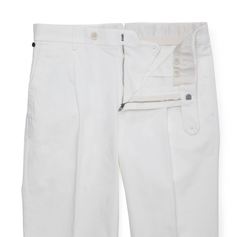 ・”FEDERICO 01 REGULAR”は、1アウトプリーツで緩やかなテーパードシルエットを描く「GTA(ジーティーアー)」のレギュラーフィットモデル。サイドポケットはスラッシュ(斜め)になっており、プリーツやフロント持ち出しと相まってシャツなどをタックインすれば腰廻りにポイントが生まれ、ベルトレスでも違和感がありません。