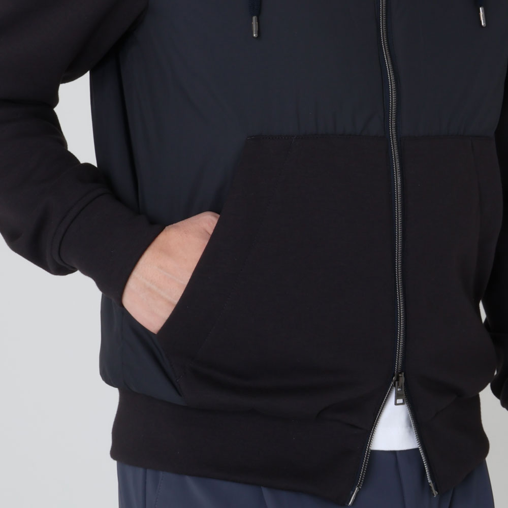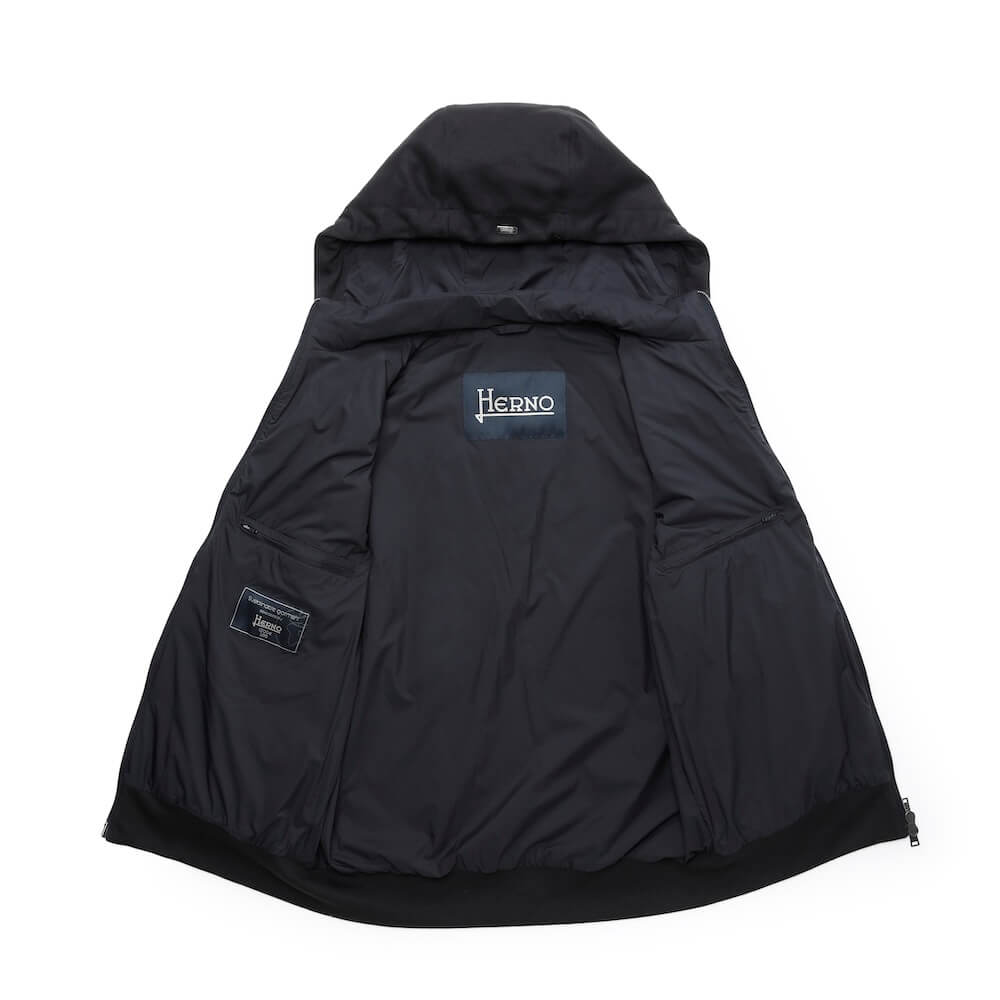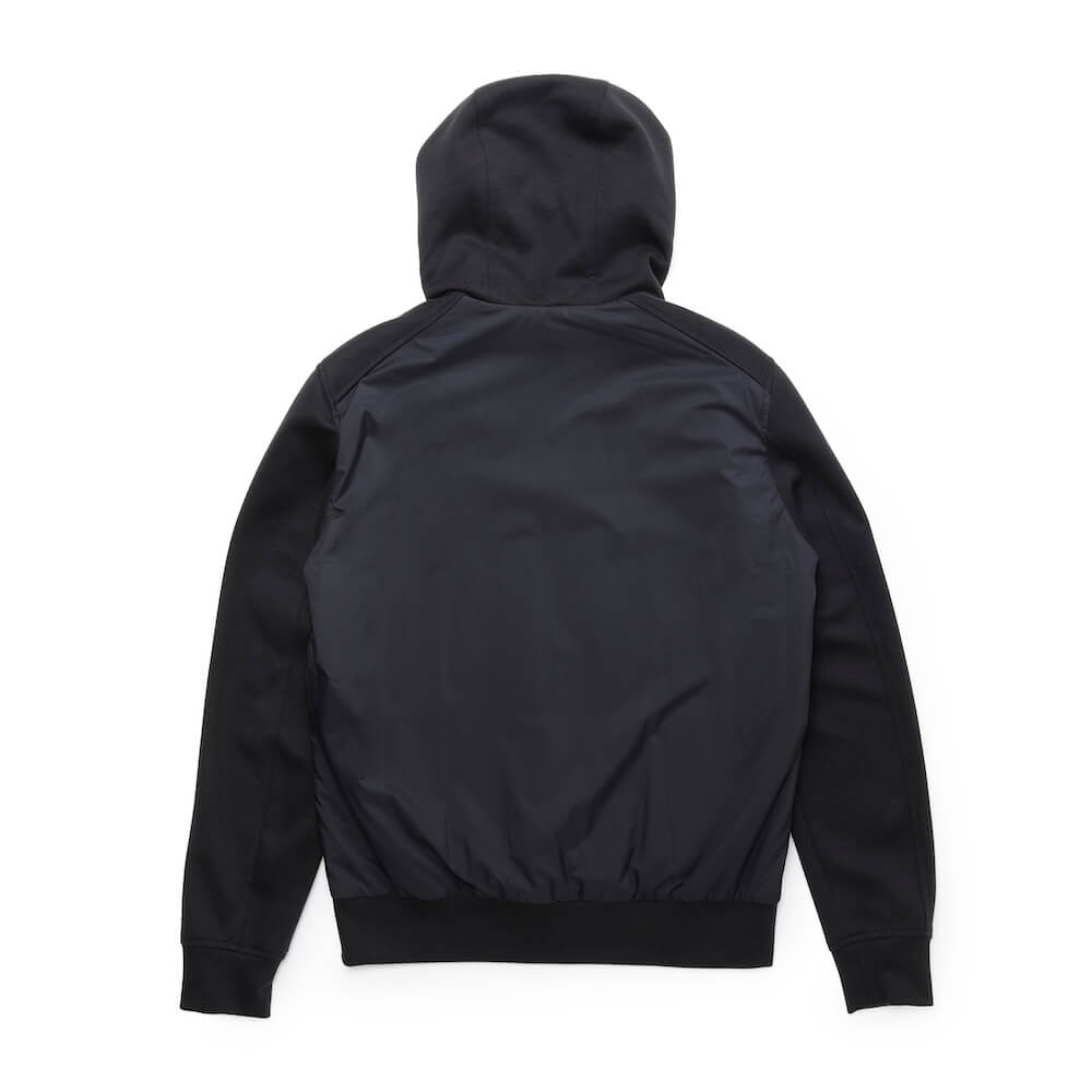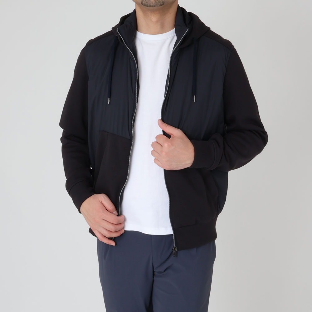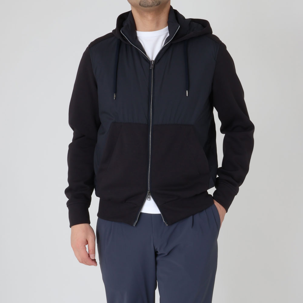 ・超極細糸で織られたナイロンとスウェットがコンビになった「HERNO(ヘルノ)」のジップアップパーカーは、二素材ともに撥水性があり、軽く柔らかな点が特徴。