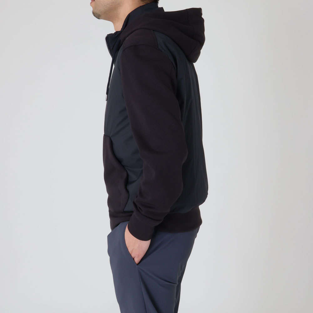 ・襟と身頃のナイロン部分には薄くポリエステルの中綿を配することで、程よい保温性を付加。夏以外の3シーズン着用できます(フード/肩の一部/袖/カンガルーポケットはスウェット素材)。