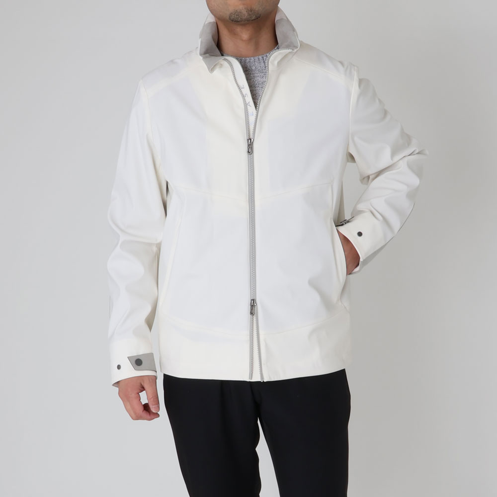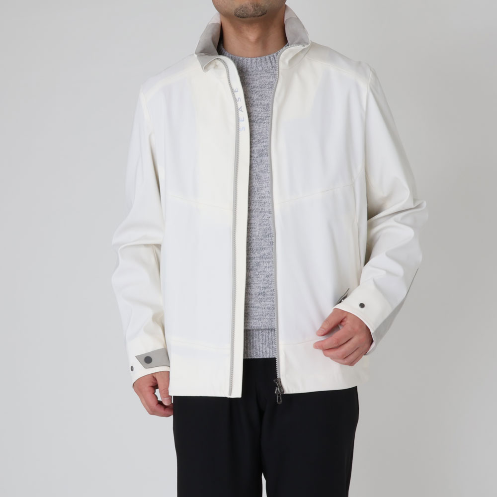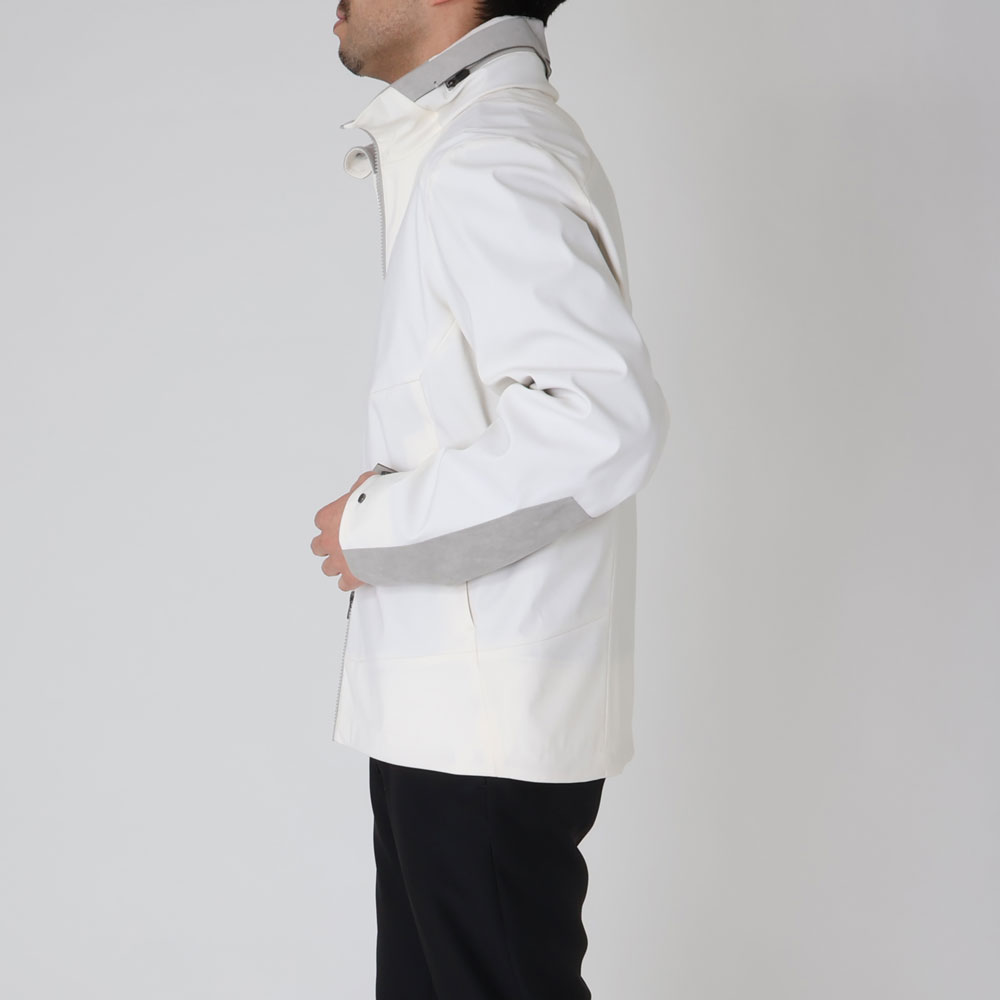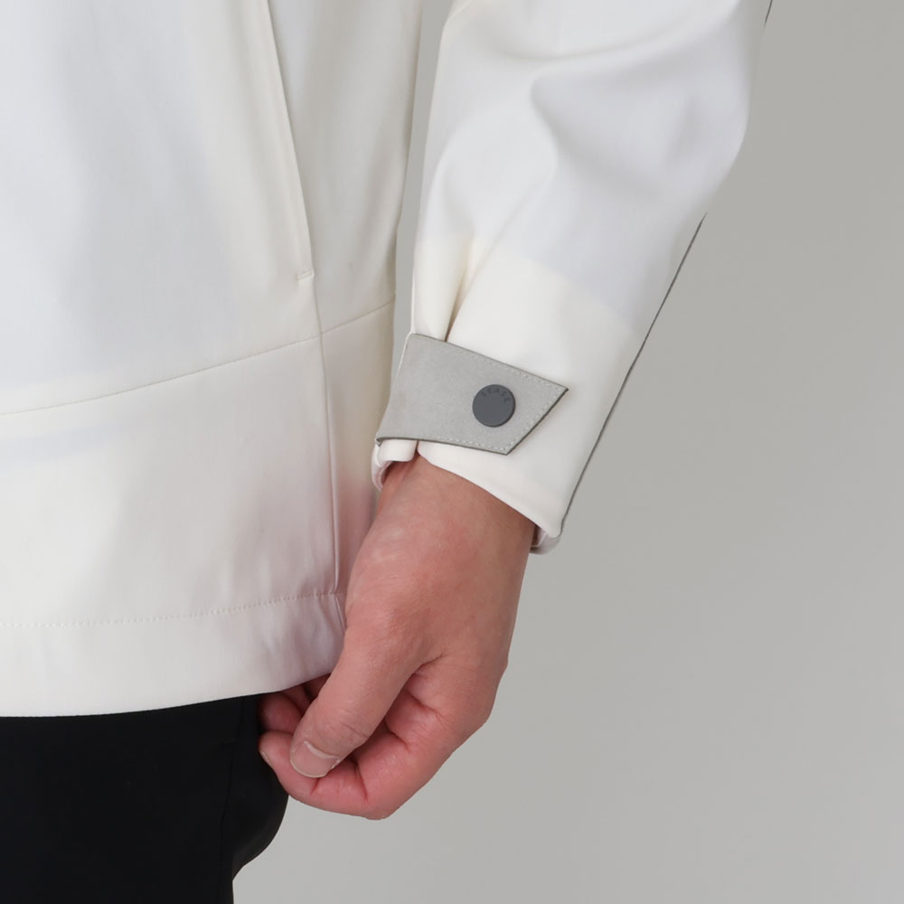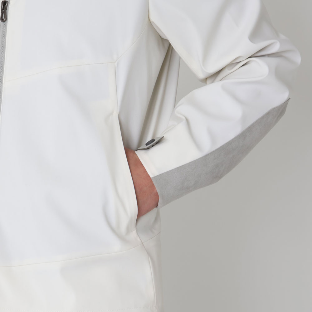 ・オフホワイトという色合いが目を惹くクリーンな色合いのアウターシェル、スタンドカラー周りや袖に用いられたライトグレーのアルカンターラ、それらにトーンを合わせたジップといった配色が機能的なジャケットに洗練されたムードをもたらします。