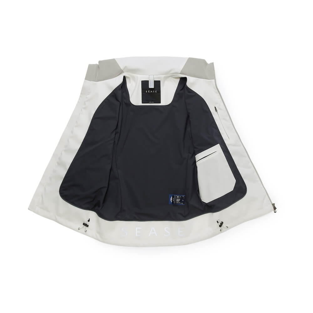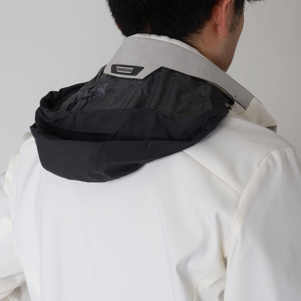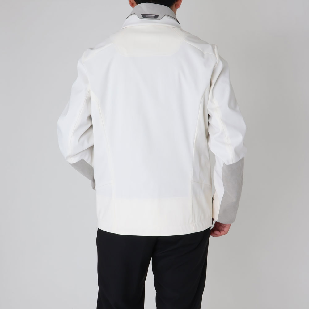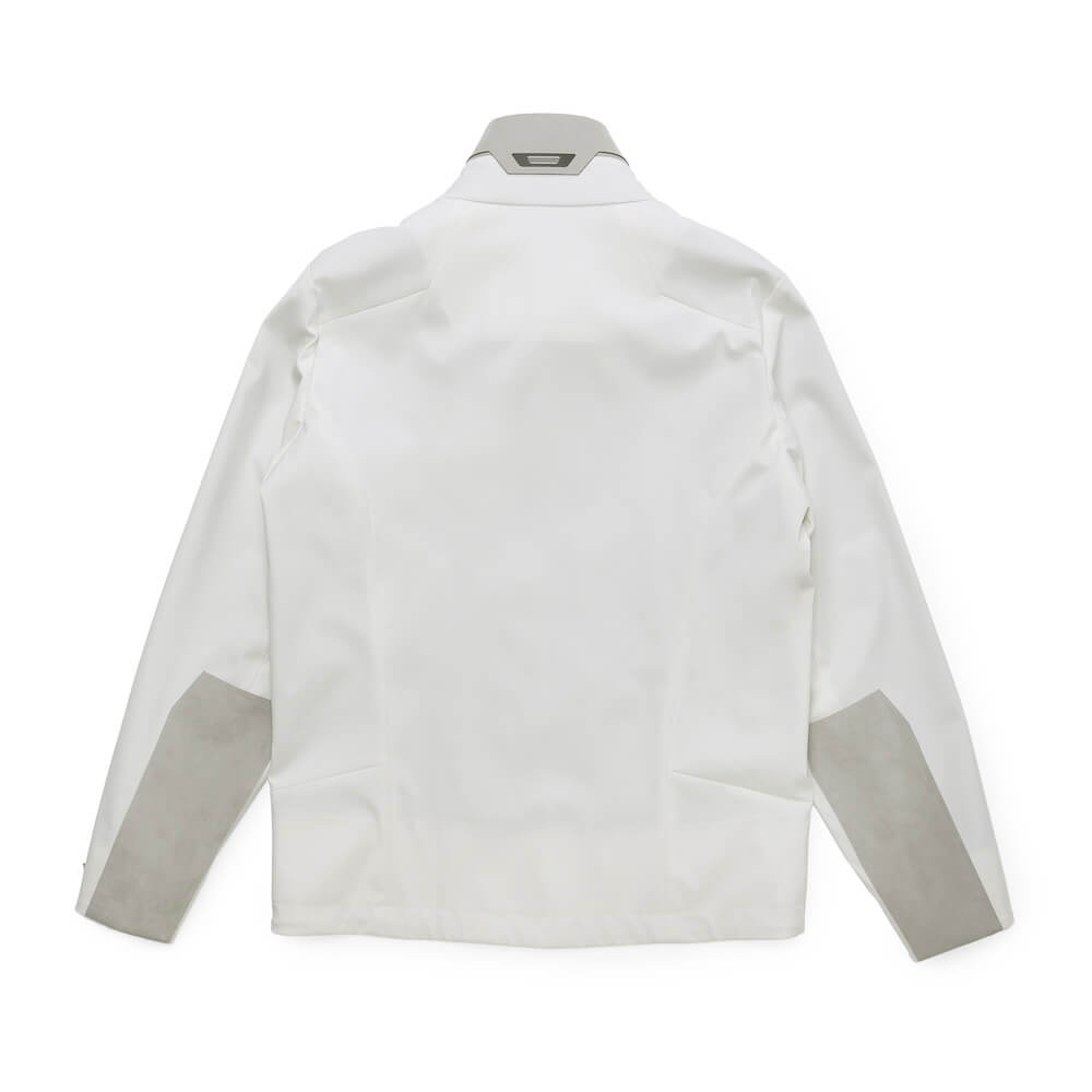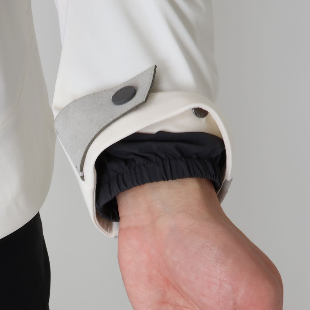 ・オフホワイトという色合いが目を惹くクリーンな色合いのアウターシェル、スタンドカラー周りや袖に用いられたライトグレーのアルカンターラ、それらにトーンを合わせたジップといった配色が機能的なジャケットに洗練されたムードをもたらします。