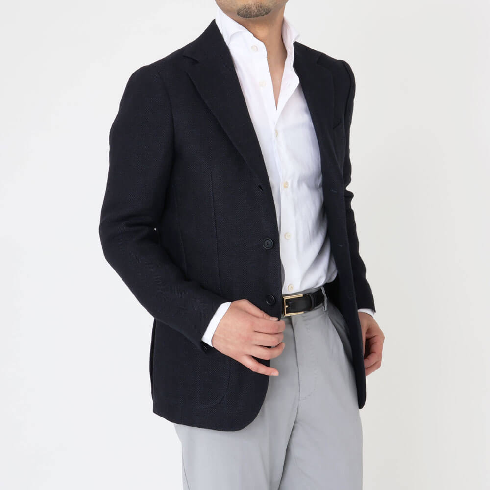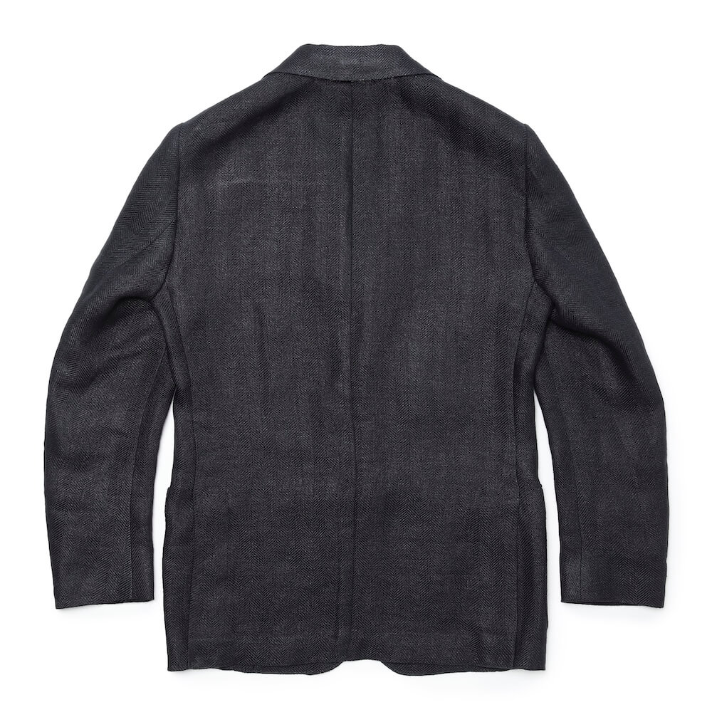 ペトリロの仕立てに、黒に近いネイビーのヘリンボーン×リネン100%の生地を載せたジャケットは、ある意味“ずるい”一着です(笑)。色気と余裕があり、純粋に格好良いと思える仕上がりです。シャツや薄手のニットの上からサイズ44を着用し、ジャストサイズでした。