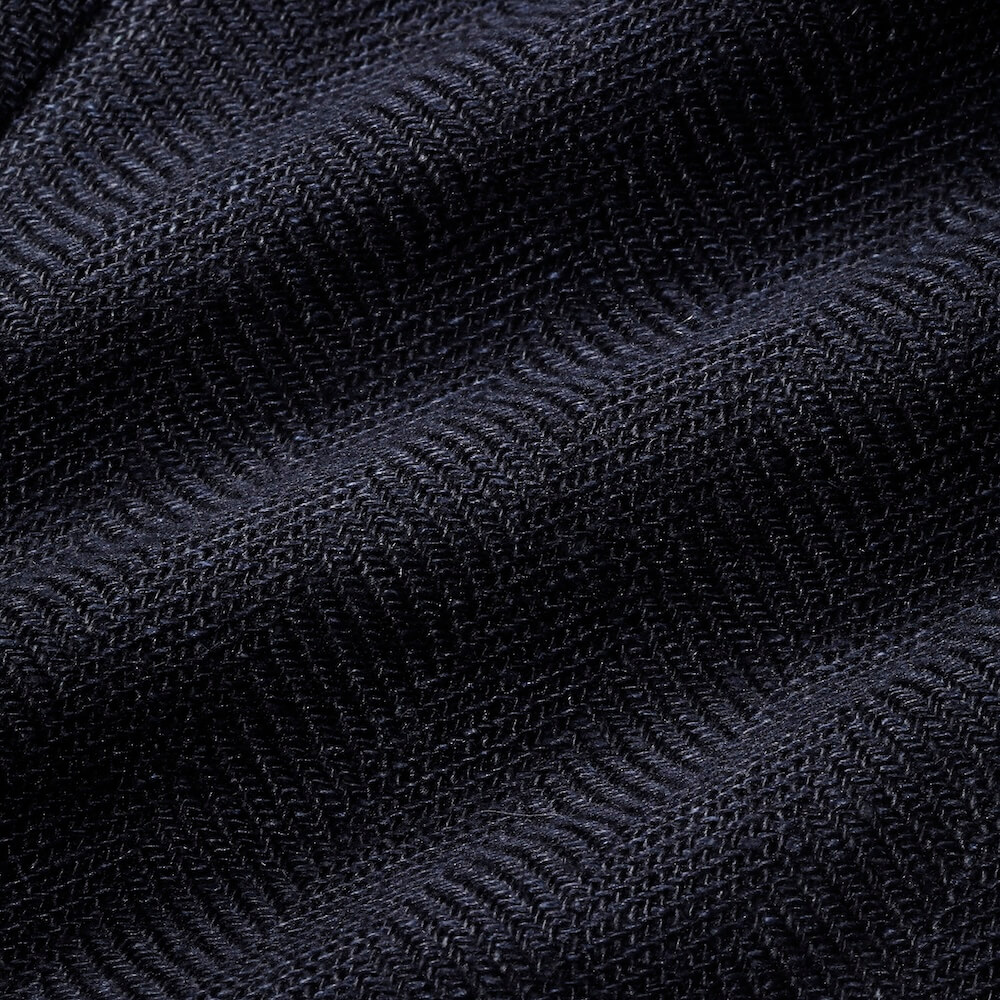・一見するとブラックのように映りますが色合いとしては深いネイビー。ただ黒糸も使われているため、モノトーンコーデもこなせる都会的な一着です。