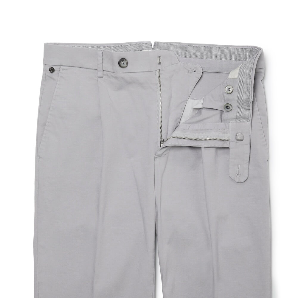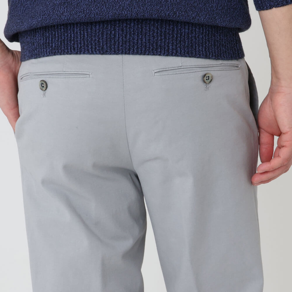 ・食事後や着席時、または動作をした際に”Waist Comfort Band”が取り付けられているウエスマンに負荷が掛かるとハーフサイズ(2センチ)程度は優に伸びるため、ウエスト廻りのストレスがかなり軽減。例えるならばウエストゴムシャーリングパンツの着用感に近いものの、普通のスラックス仕立てに外見上は見える、という画期的な仕様です。