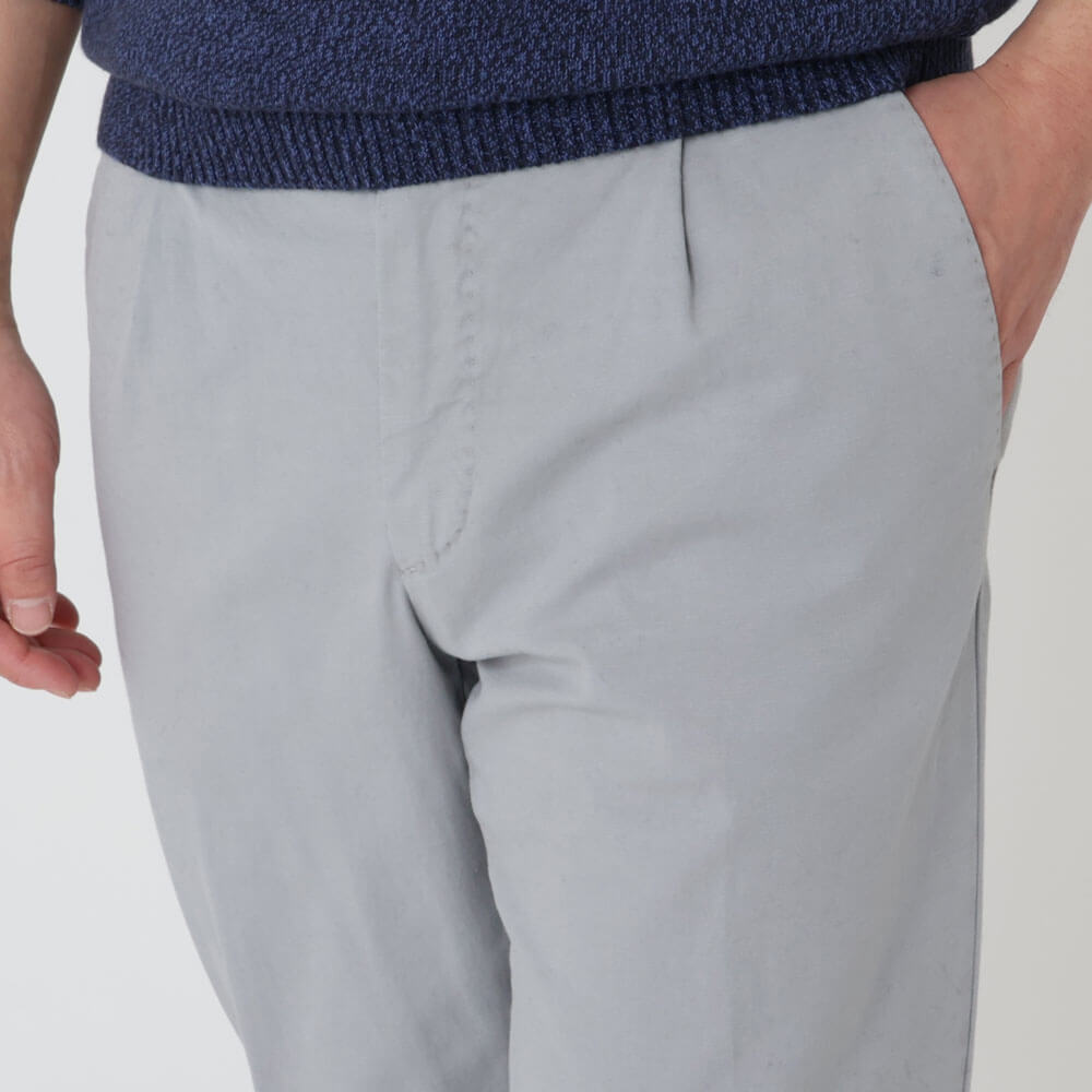 ・コットンをベースにリネンをブレンドしストレッチを効かせた生地は、後染めならではのこなれ感と春夏シーズンにピッタリな涼しげな風合いが特徴。ご自宅でケア(手洗い)できるお品物です。全3色(オフホワイト/アイボリー)のラインナップ。