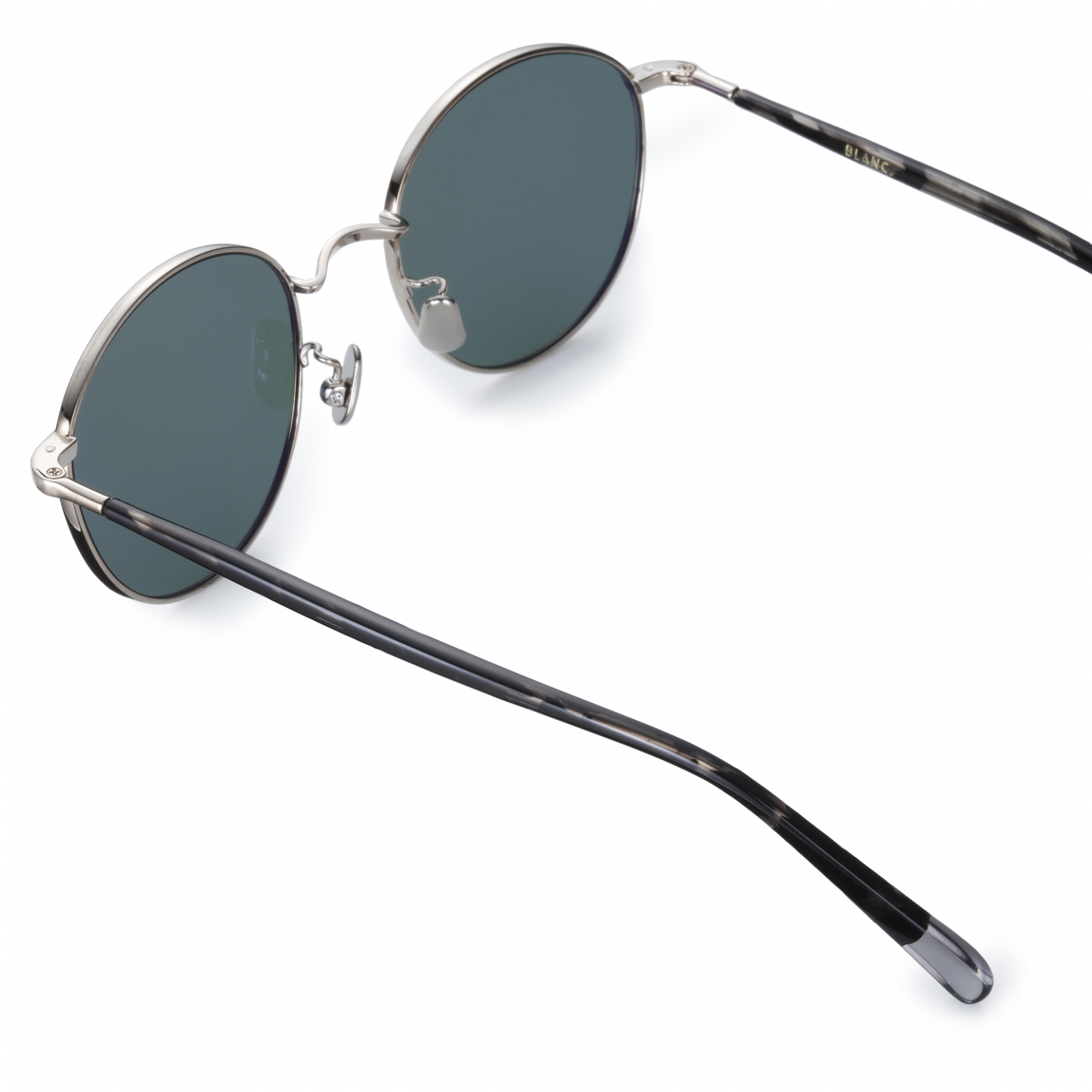 ・シルバーフレームのレンズはハーフミラーコート。元々はブラウンのレンズにブルーがコーティングされており角度によって変わる色合いがクールに映ります。