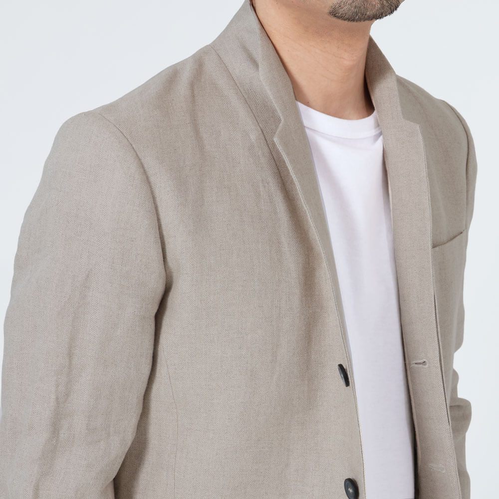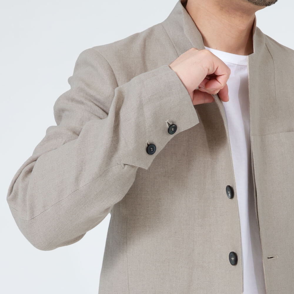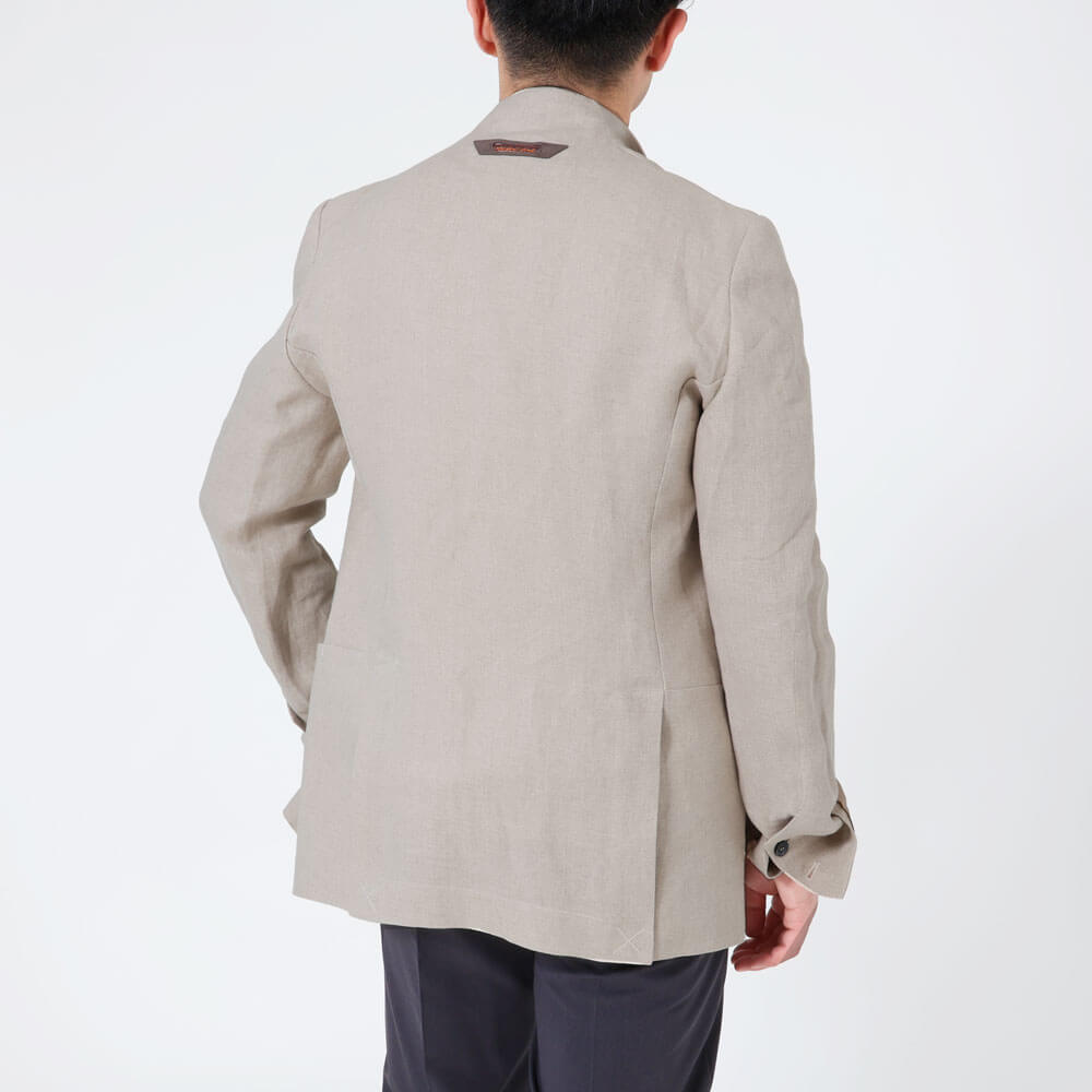 • 背抜き仕上げ、前身頃リネン裏地、袖裏地あり、前の第一ボタンのみフライフロント、袖口ボタン2つ開閉可能、サイドベンツ、胸ポケット1つ、腰ポケット2つ、内ポケット2つ