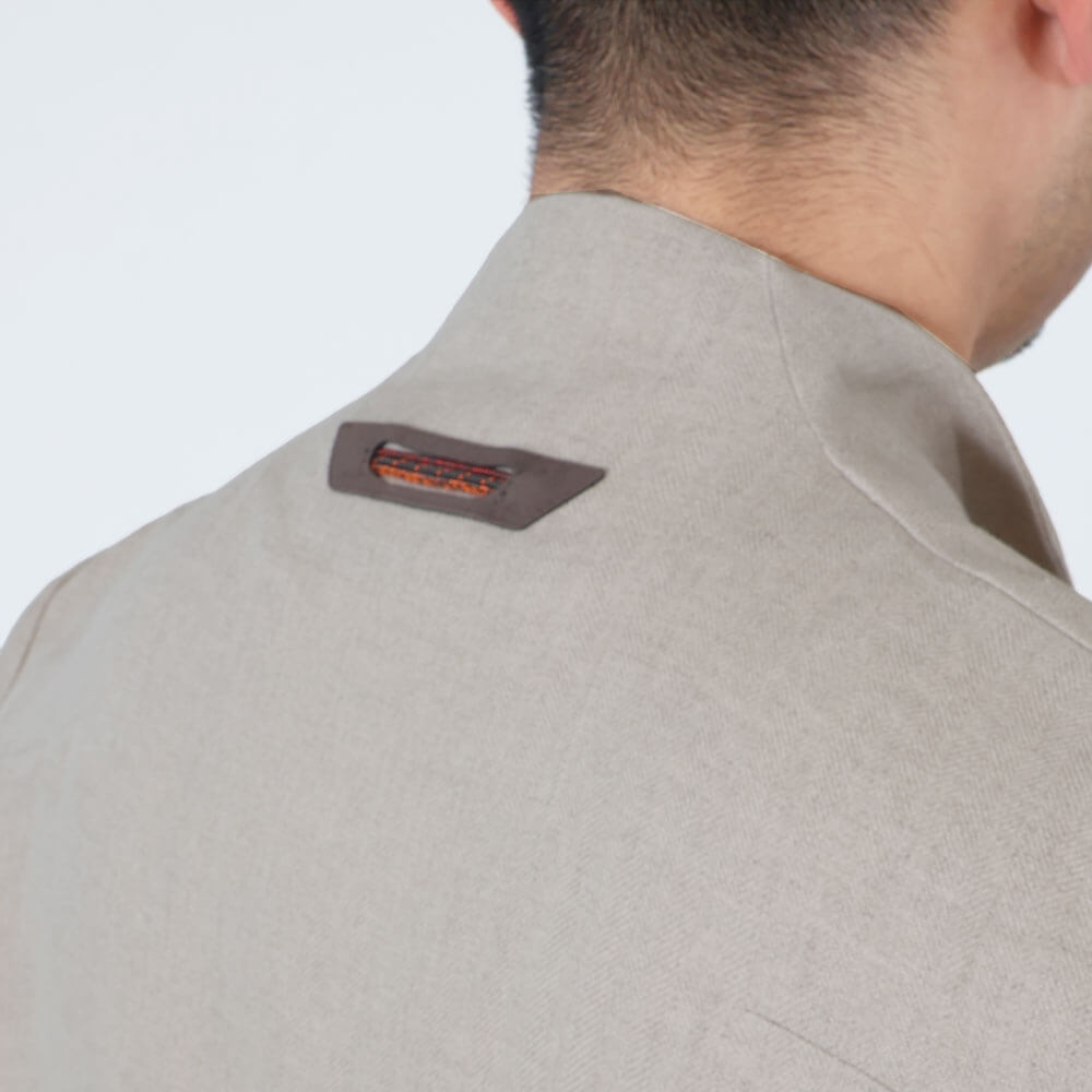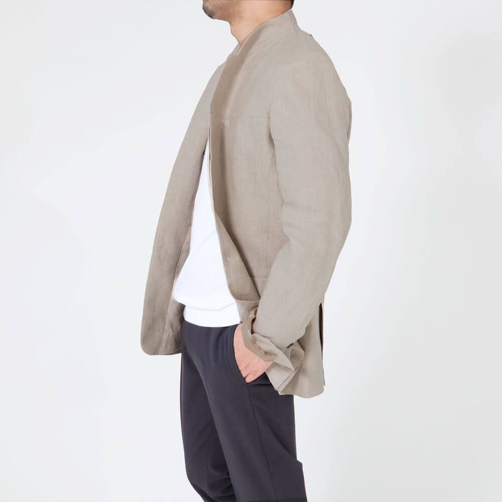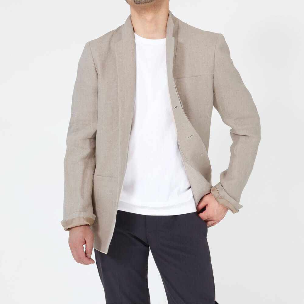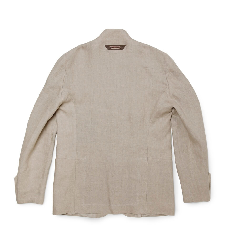 • 背抜き仕上げ、前身頃リネン裏地、袖裏地あり、前の第一ボタンのみフライフロント、袖口ボタン2つ開閉可能、サイドベンツ、胸ポケット1つ、腰ポケット2つ、内ポケット2つ
