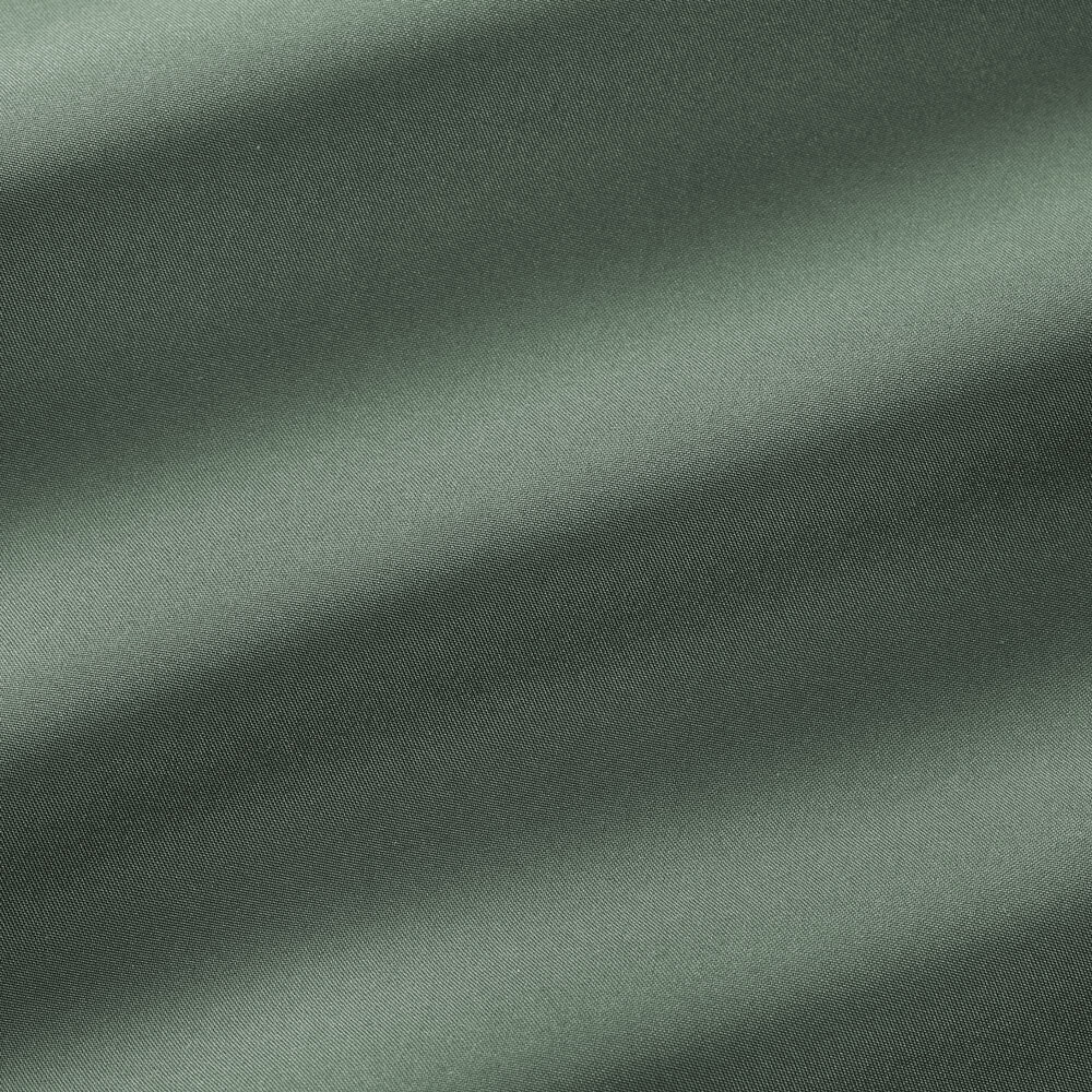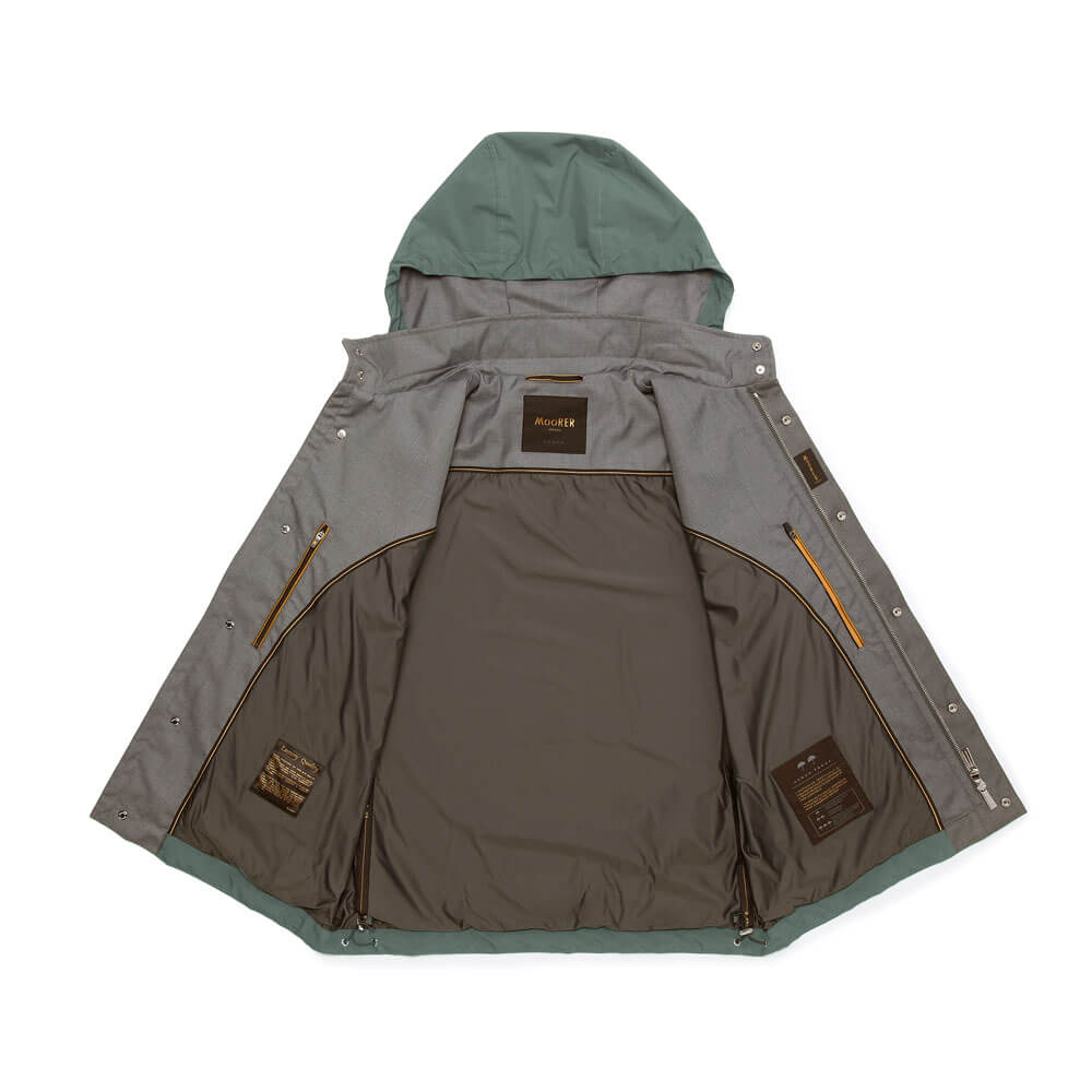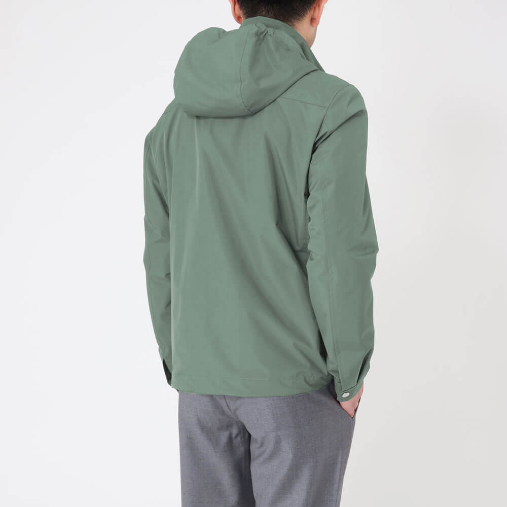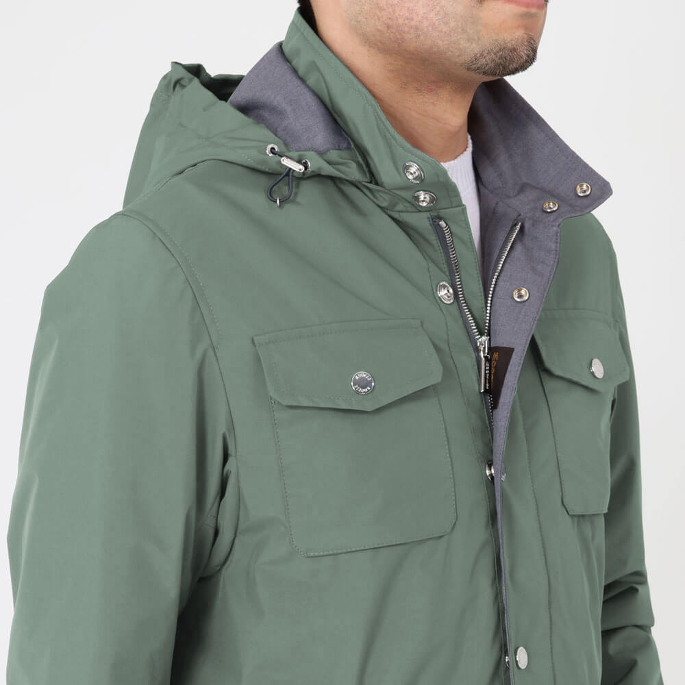 ・ウール見えするグレー裏地が、フード/スタンドカラー/前立てなどに付けられており、表地のくすみ感あるグリーンとのコントラストが上品な雰囲気を醸します。